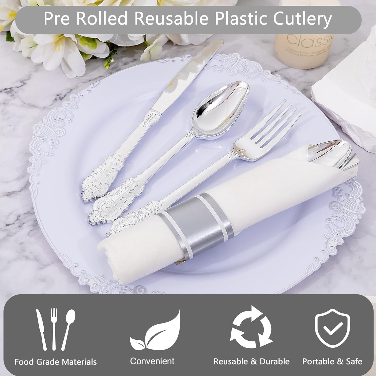 400PCS Pre Rolled Silver Plastic Silverware Sets - Heavy Duty Fancy Silver Cutlery - Include 100 Pack Wrapped Disposable Utensils with Napkins for Parties, Dinners & Weddings