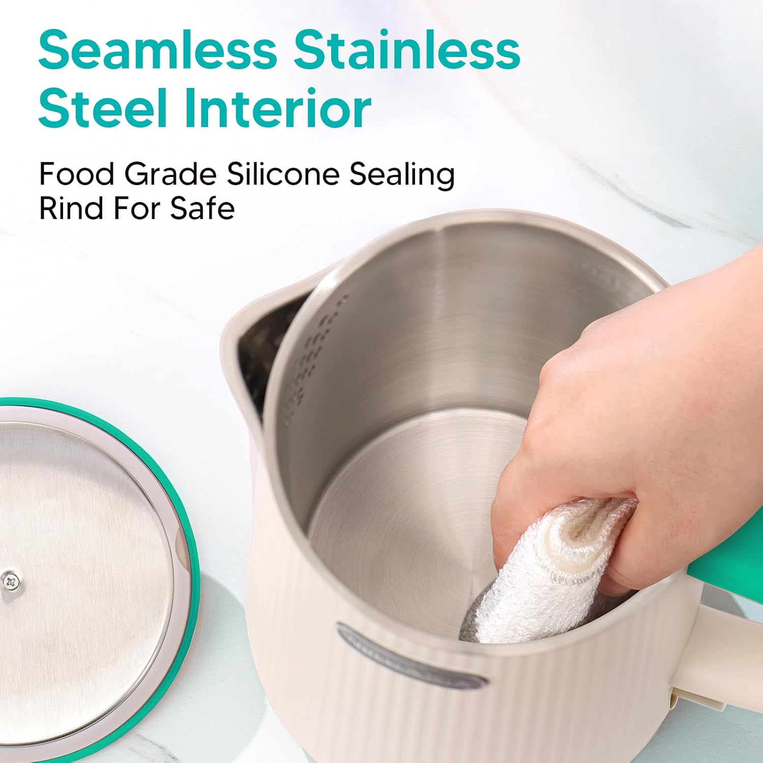 - ใEnjoy Safe and Healthy Drinking Waterใ~ Made from the seamless 304 stainless steel interior (stainless steel liner, stainless steel spout, stainless steel lid) and the food-grade material sealing ring on the lid, this electric tea kettle provides hot drinks with the pure flavor and long-term operation. The wide opening and removable lid make the electric water boiler kettle easy to reach hand in for cleaning.