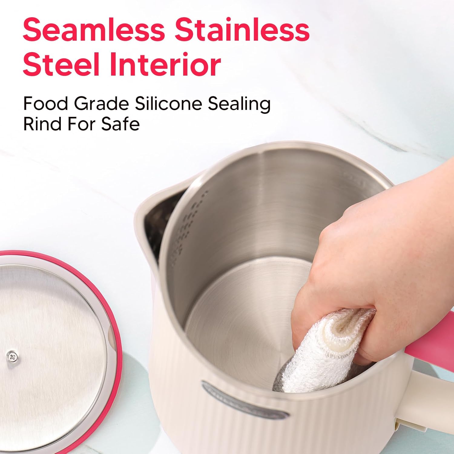 - ใEnjoy Safe and Healthy Drinking Waterใ~ Made from the seamless 304 stainless steel interior (stainless steel liner, stainless steel spout, stainless steel lid) and the food-grade material sealing ring on the lid, this electric tea kettle provides hot drinks with the pure flavor and long-term operation. The wide opening and removable lid make the electric water boiler kettle easy to reach hand in for cleaning.