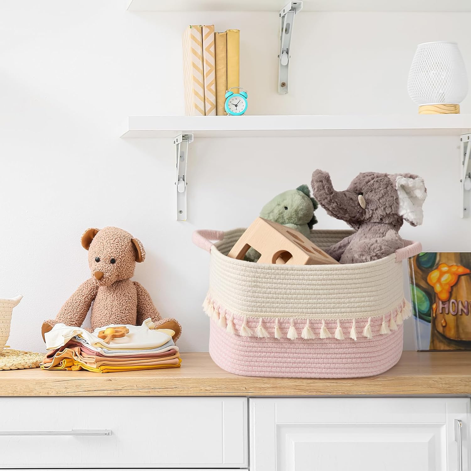 TeoKJ Storage Baskets 3 Packs, Storage Basket for toys,Towel, Storage Bins, Woven Basket for Shelves Bedroom Laundry Nursery, White & Pink
