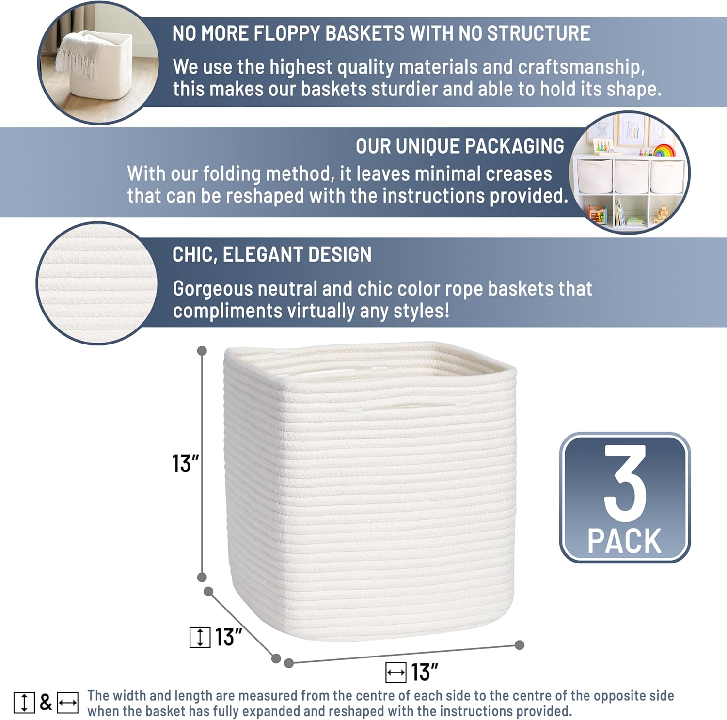 NaturalCozy 13 Inch Cube Storage Bins Cotton Rope Woven Baskets for Organizing 3-Pack | 13 x 13 Storage Cubes | Fabric Square Storage Baskets for Shelves Organizer, Kids Toy Bins, Closet Baby Nursery