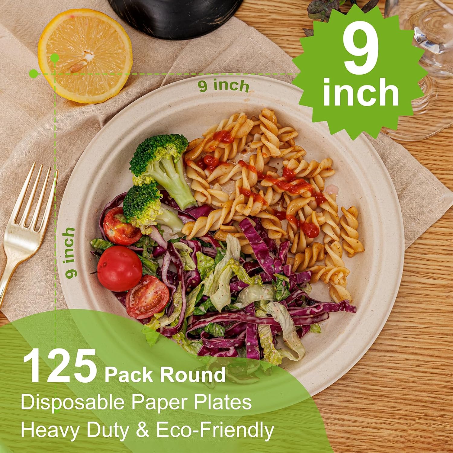WELLIFE 100% Compostable Paper Plates 9 Inch, 125-Pack Heavy Duty Paper Plates Bulk,Biodegradable Bagasse,Eco-Friendly Disposable Dinner Plate for BBQ,Picnic,Party (BPI Certified,Microwaveable)