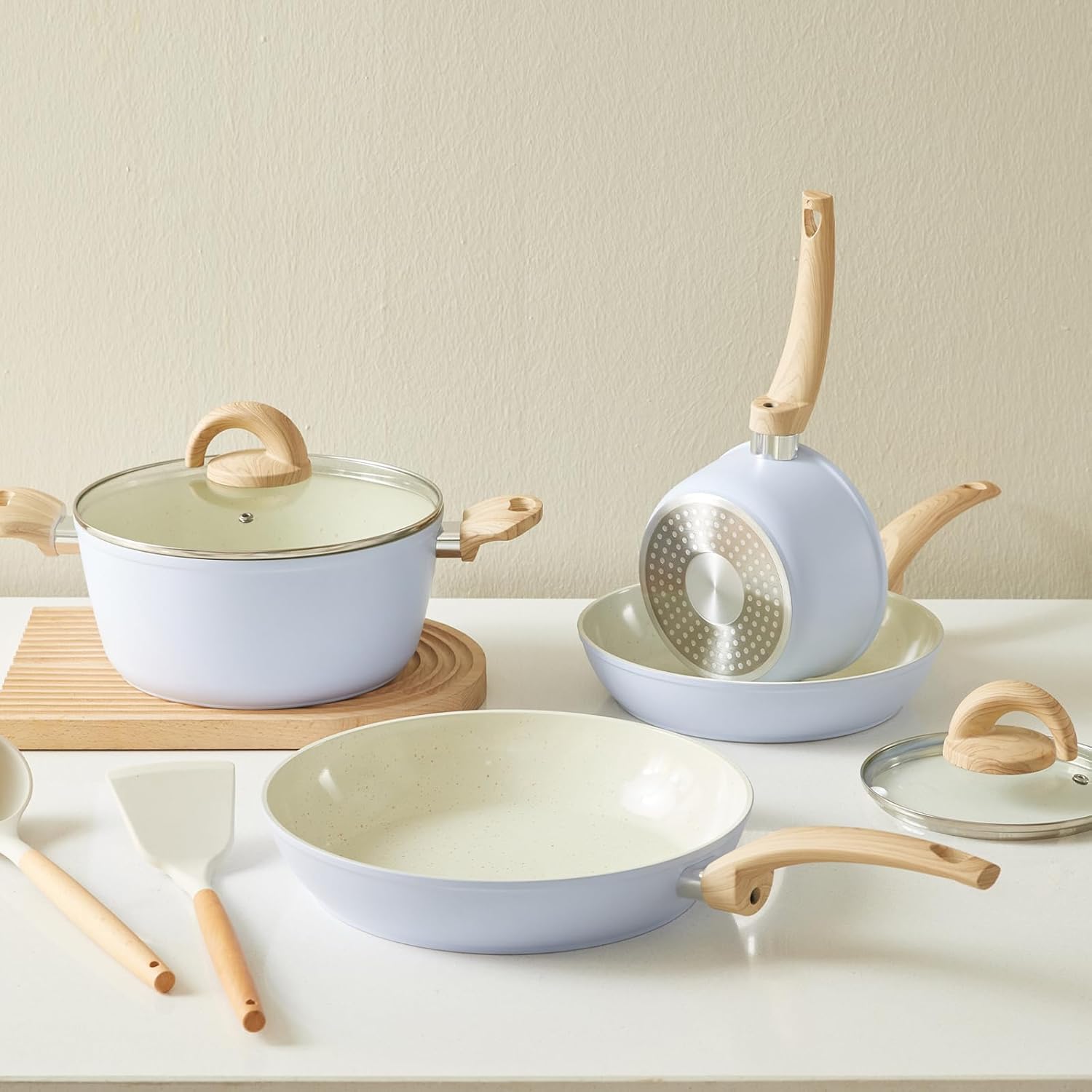 - Enjoy a tasty and safe cooking experience with the Vkoocy Series Set! This 12-piece cookware set includes a 9.5" frying pan, 11" frying pan, 1.5-quart sauce pan with Lid, 5-quart stockpot with Lid, pack of 2 Silicone Cooking Spatula, a set of pot protectors. This set contains all the tools you need to fry, sear, roast, and simmer your favorite dishes without worry. Plus, It's also specially decorated with patterns to make your kitchen blend with nature;
