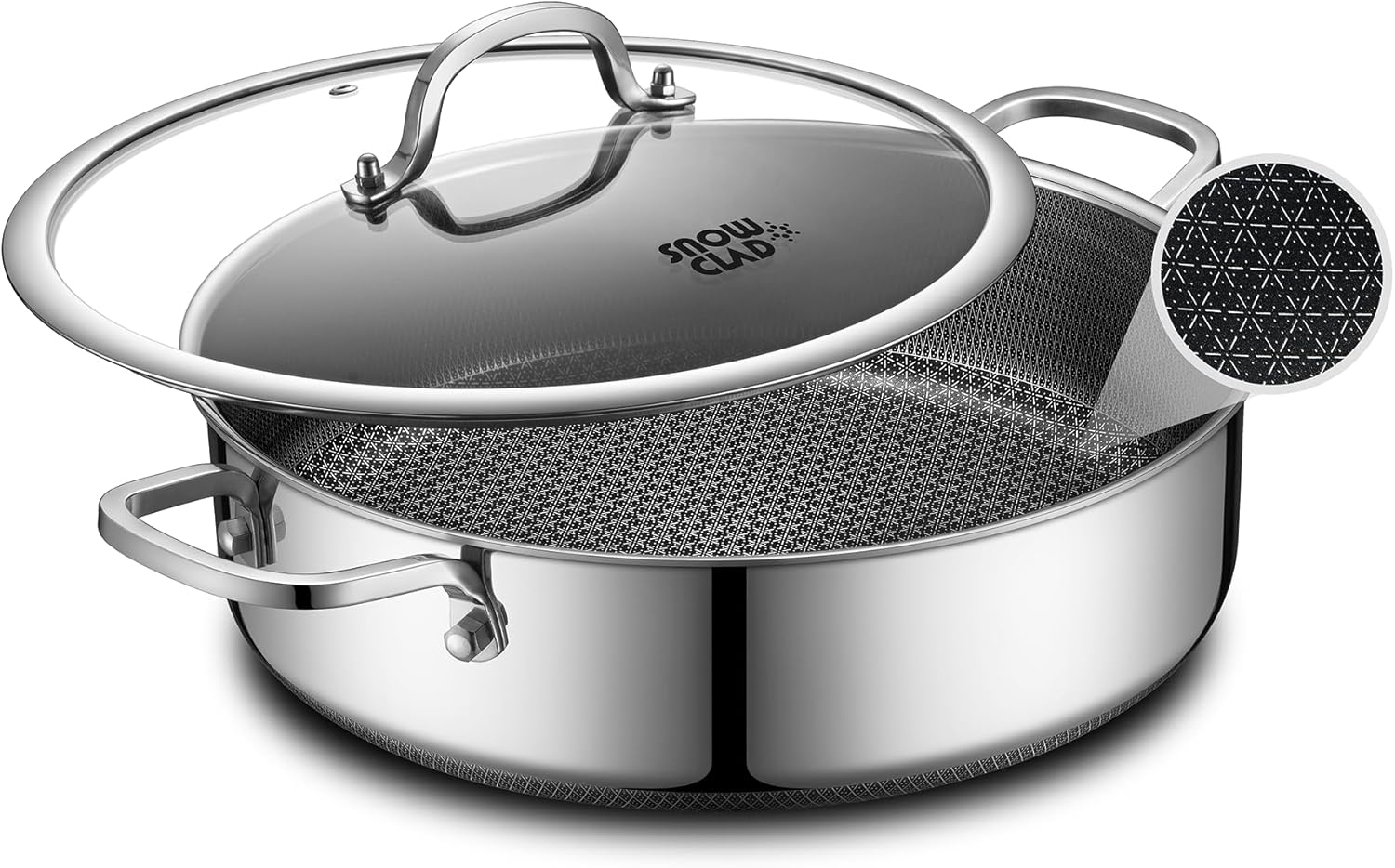 - 【SNOWFLAKE TECHNOLOGY】Our design is created through a laser etching process to provide both stainless steel and non stick surface. This dual surface allows to cook with less oil, grease, and butter.Our clad surface is 50% more than usual Hex surface non stick frying pans.