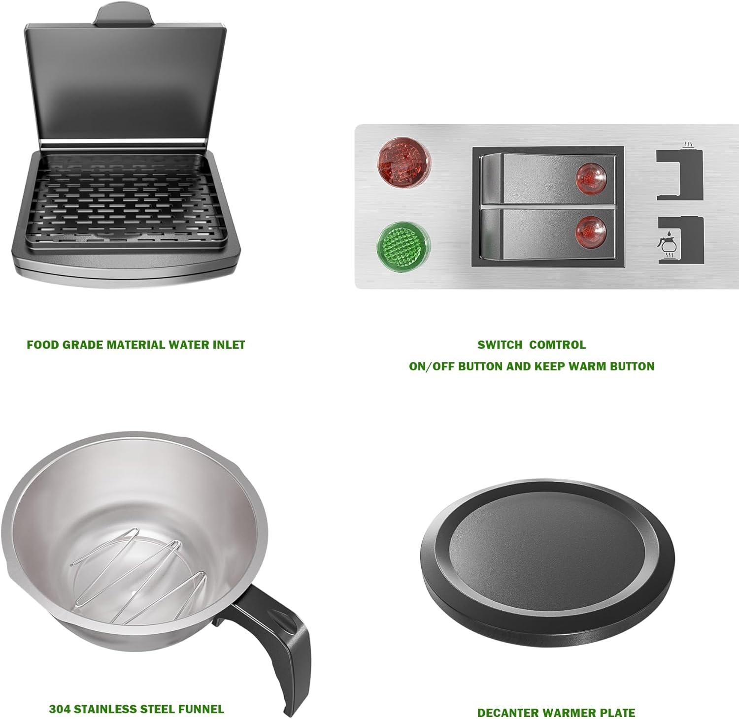 - Four Hot Plates: Four warming panels keep your drip coffee machine working all the time and the coffee from getting cold. Both warmers are controlled by individual switches. Whether you are making coffee for 10 people or 100, you'll always have fresh and warm coffee again and refill another cup. This stainless steel coffee maker is suitable for commercial settings like restuarant, cafeterias, beverage stations, also for parties and gatherings use