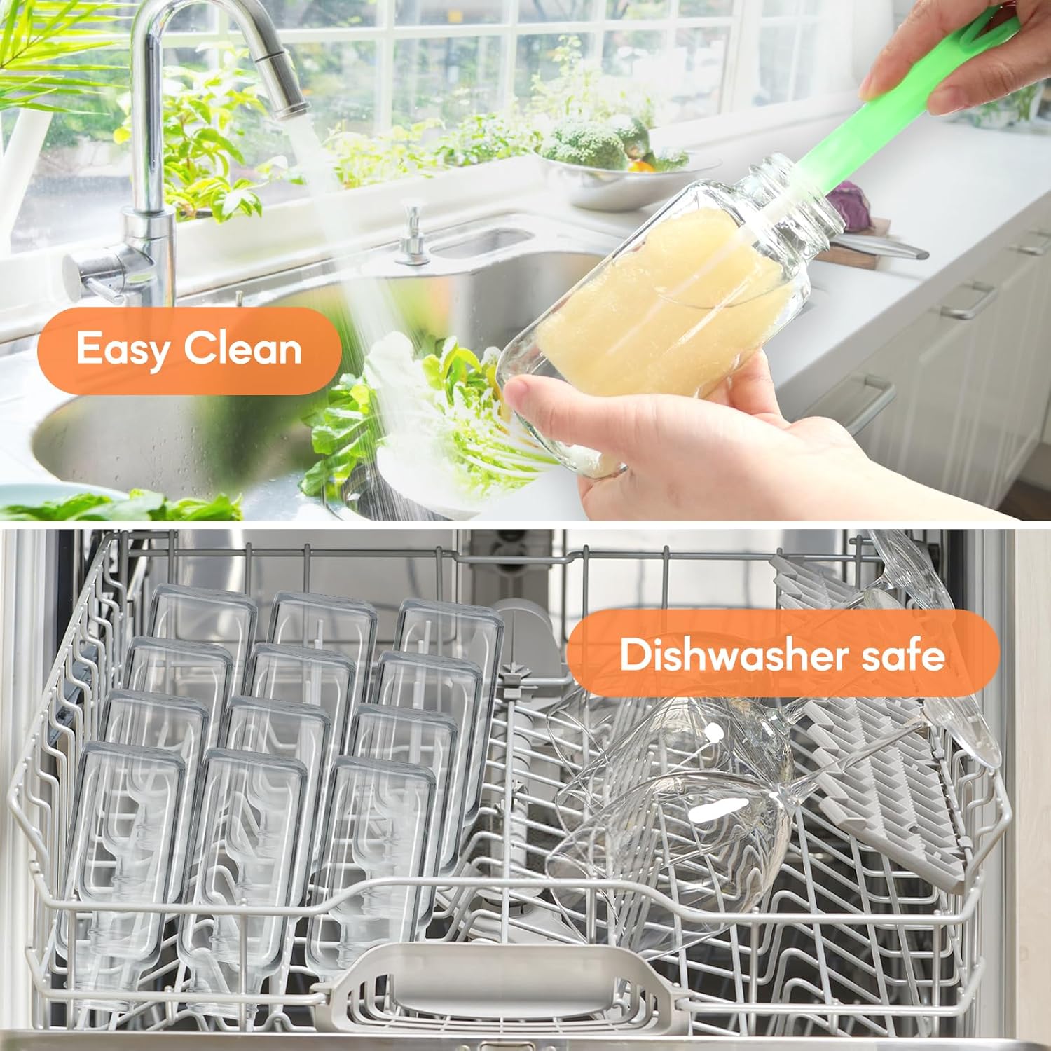 - Effortless Maintenance: Top-rack dishwasher safe; soft sponge brush effortlessly cleans square bottle corners with contoured design; flexible material conforms to angles for quick residue removal; gentle on glass with no scratching risk
