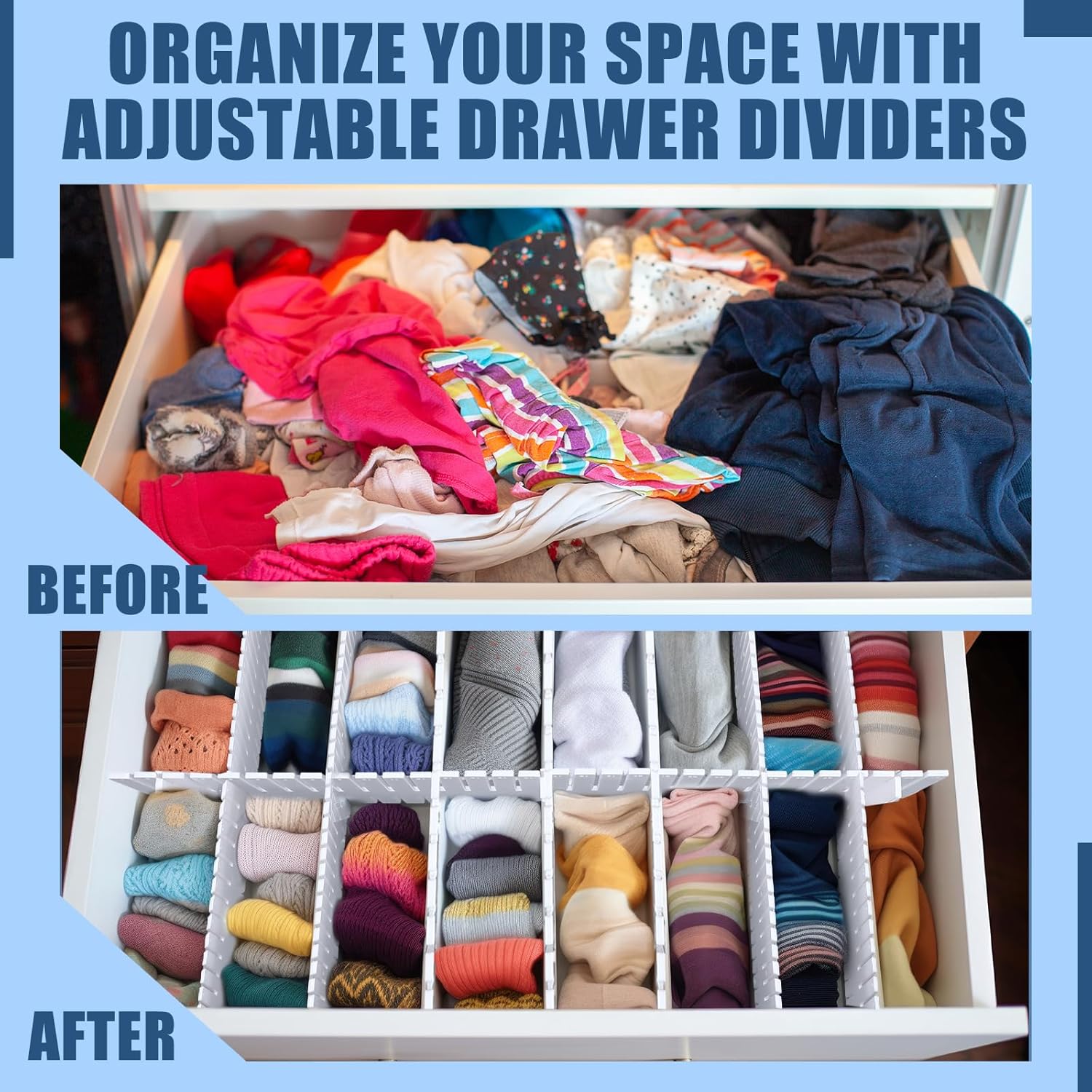 - Transform Your Space: transform your chaotic drawers into a picture of neatness and order with our socks drawer separators; The bespoke design makes it ideal for any drawer, helping you reclaim lost space and introducing calm where there was once clutter