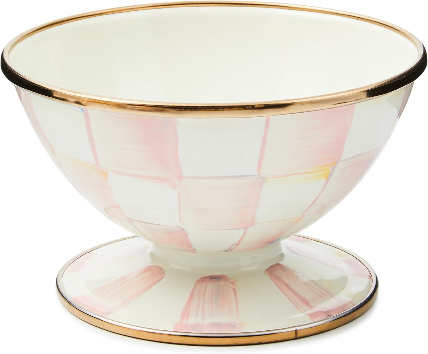 - ENTERTAINING & PARTY ESSENTIAL: The pretty Rosy Check pattern on this small bowl features glossy, high-contrast hand-painted pink-and-white checks. It has a hand-glazed heavy-gauge steel underbody and is trimmed in gold luster.