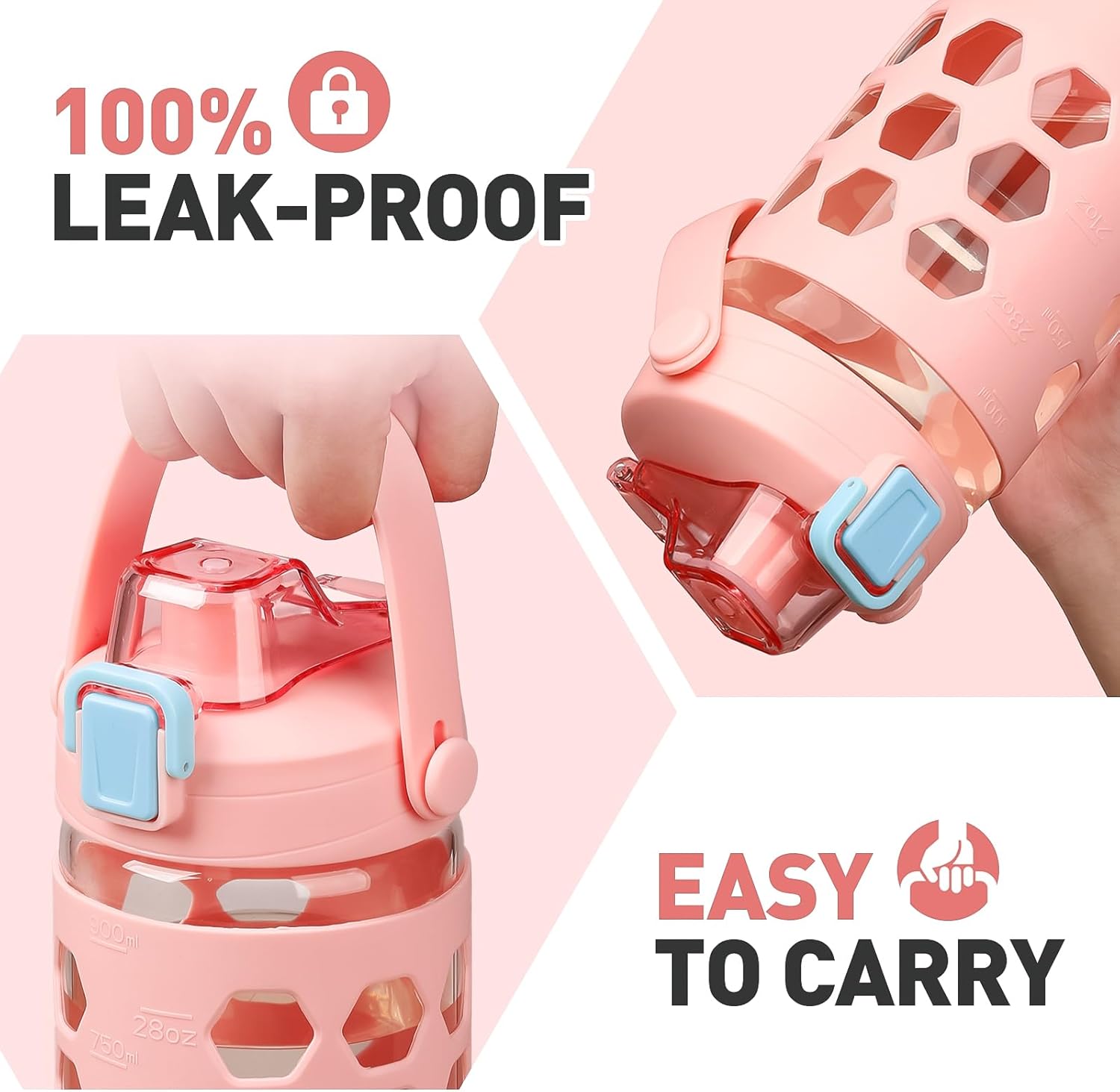 MUKOKO 32 oz Glass Tumbler with Straw,Glass Water Bottles with Time Marker,Iced Coffee Cup with 2 Lids-Handle Spout Lid&Straw Lid,Silicone Sleeve,Leakproof,1 Pack-Pink