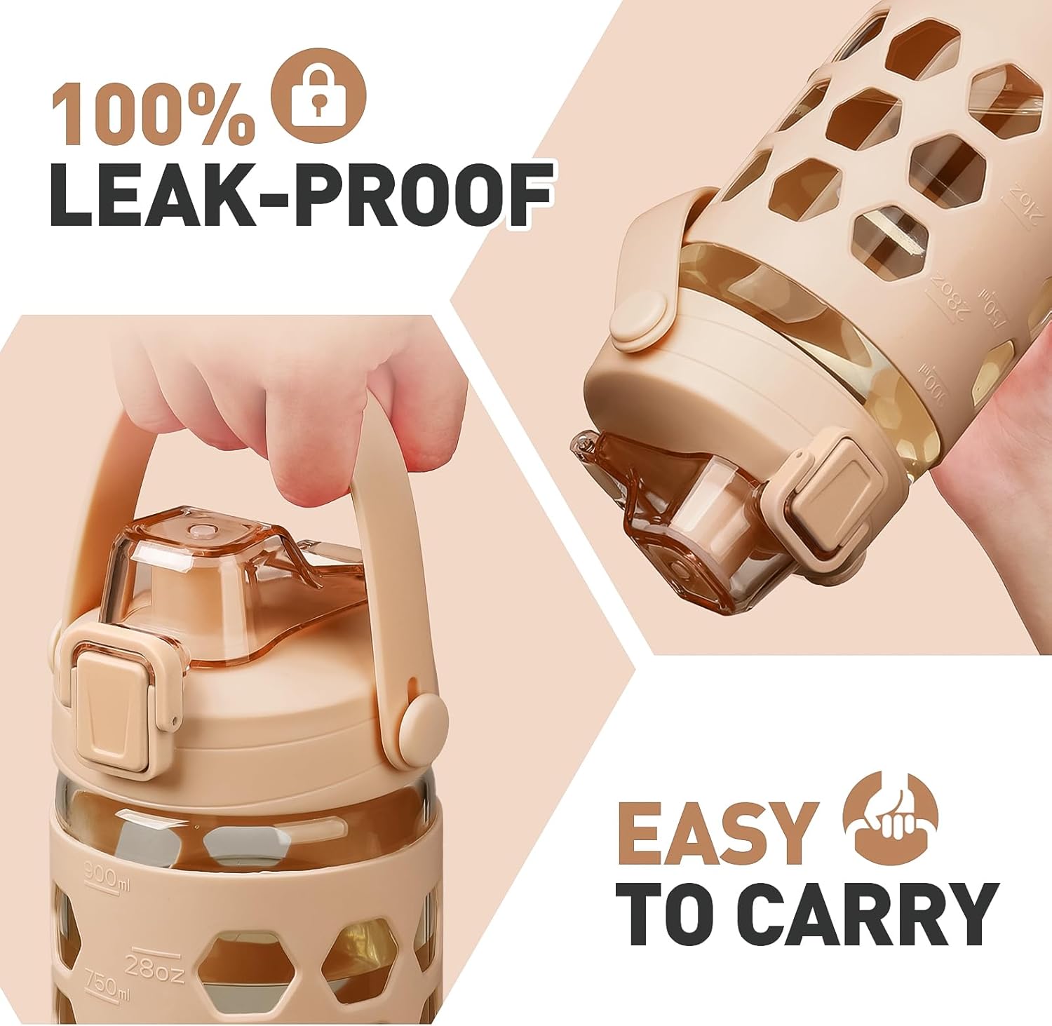 - SILICONE SLEEVES FOR BETTER GRIP:Use this water tumblers at home, office, take it to the gym or anywhere really! Our glass water bottles comes with a stylish silicone sleeve to offer you additional protection and to provide an extra grip to the bottle. The sleeve is removable, so you can use the water jug with or without it.