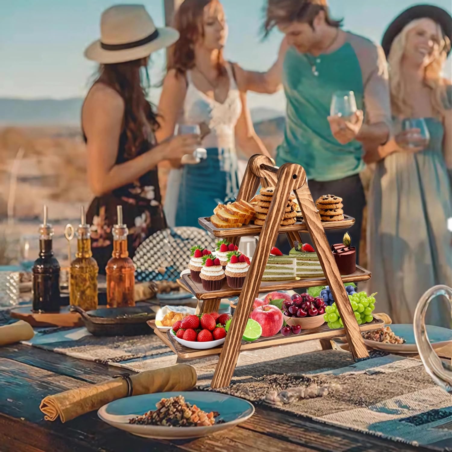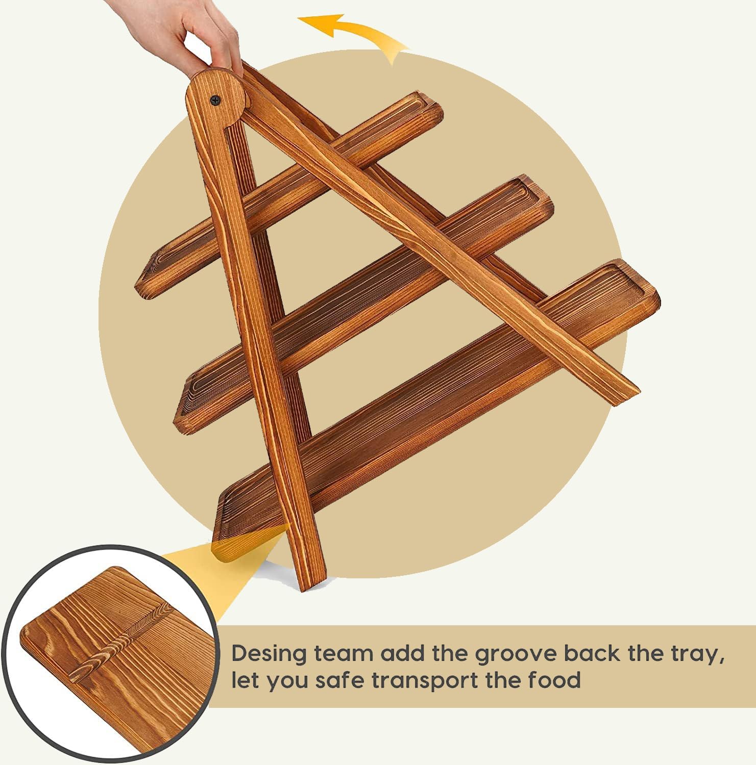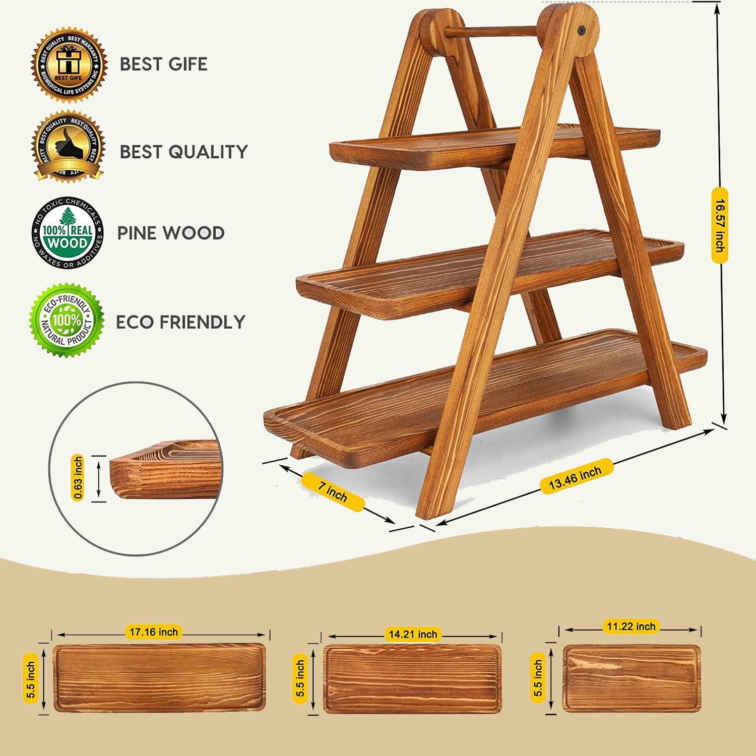 - Natural Wooden Serving Trays:Our wooden plates is 100% health, Made of high-quality pine Wood tray,With unique wood tones and textures,the surface is extra polished to give the wooden plate a glossy and smooth finish, no rough edges or splinters or cracks, just slight smell of nature wood. We add groove under the platters to let 3 tier tray sit sturdy on ladder.