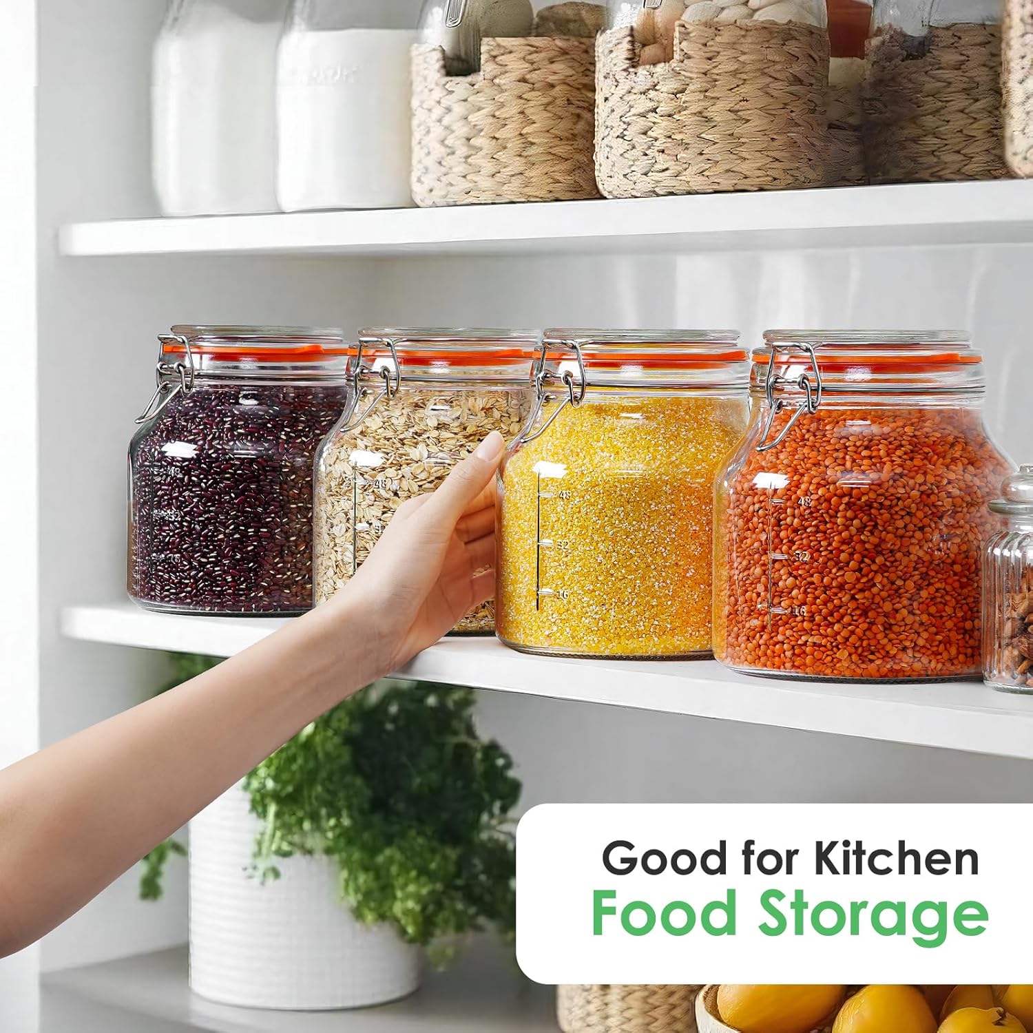 - Leak-Proof Glass Hinged Lid: The glass storage jars with lids and metal wire closure, which is very easy to open and close. In addition, the lid also has a removable silicone gasket, 2 extra white replacement gaskets, which is airtight and leak-proof, allowing food to be preserved for longer