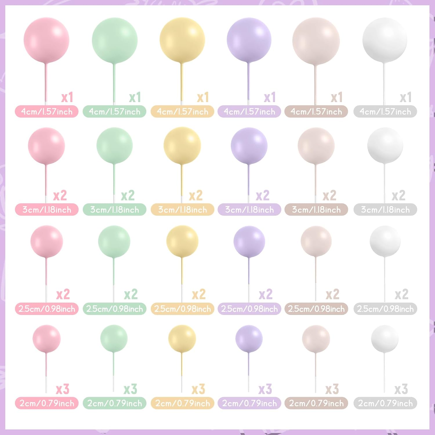 - Various Sizes: The diameter of these ball cake toppers are 0.79 inch/ 2 cm, 0.98 inch/ 2.5 cm, 1.18 inches/ 3 cm, 1.57 inches/ 4 cm, 12 pieces of each size. You can make a proper position arrangement based on the size and shape of your cake, sufficient quantity and various color of our ball shaped cake topper can meet your different needs