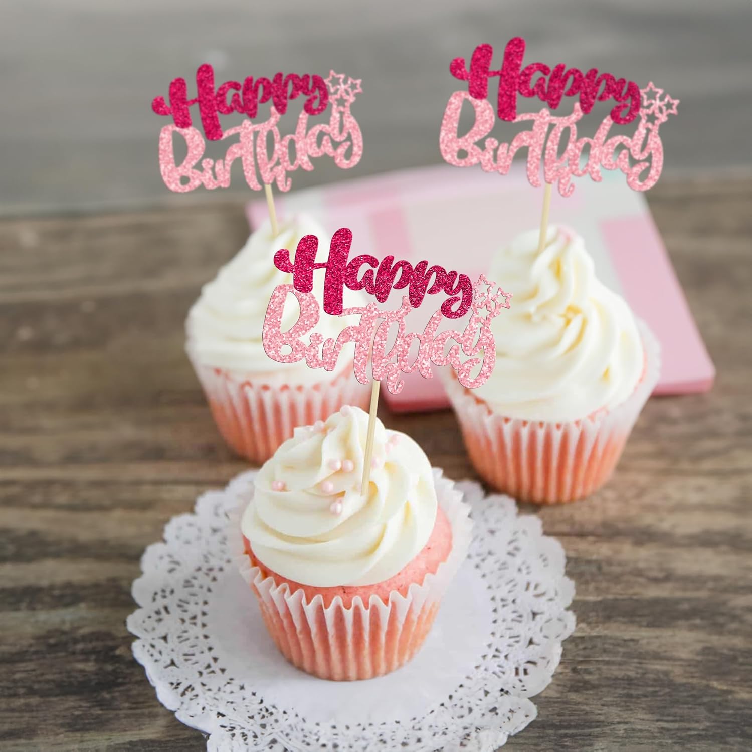 Ephlyn 24Pcs Happy Birthday Cupcake Toppers Double Layer Glitter Happy Birthday Cake Decorations for Celebrating Baby Shower Theme Kids Boys Girls Birthday Anniversary Party Supplies Rose Red Pink