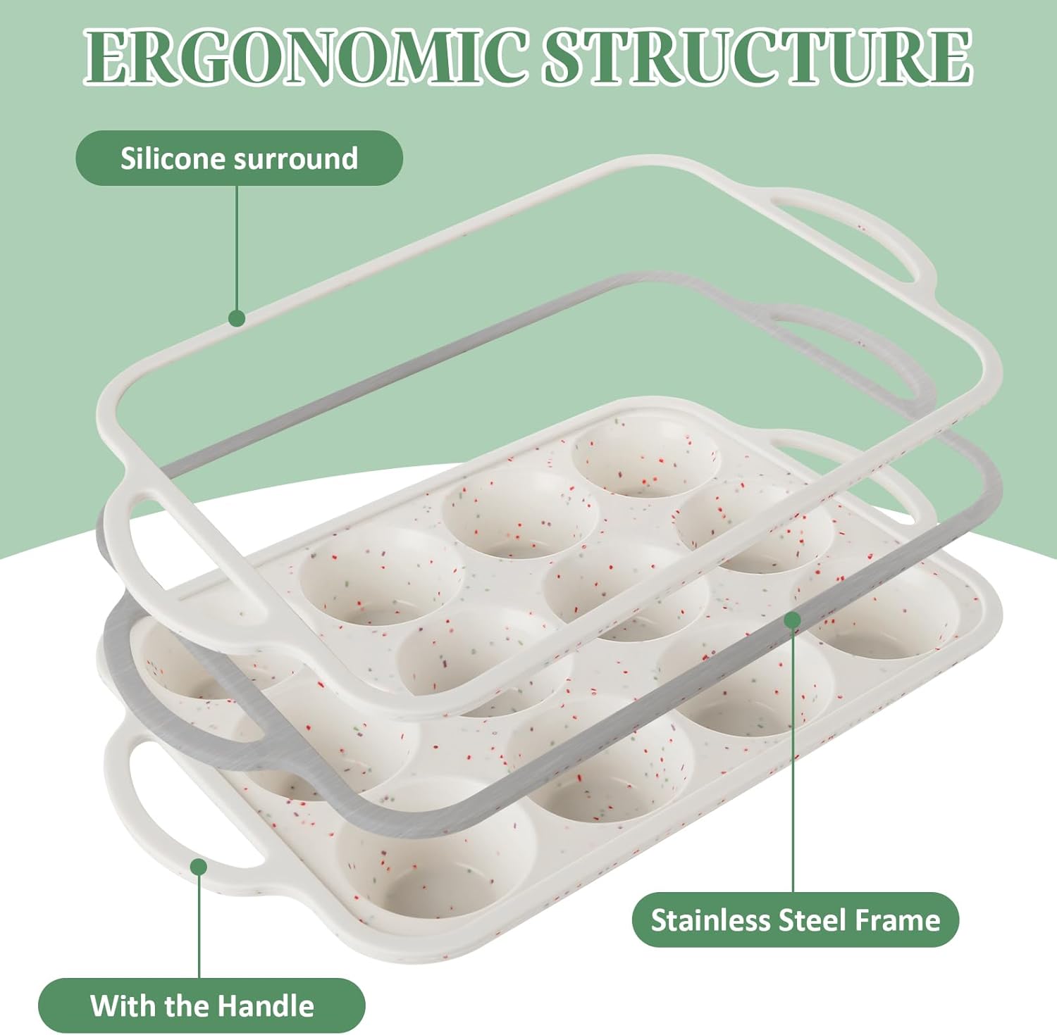 - METAL STRUCTURE: The hidden stainless steel frame around the outer edge makes silicone muffin pan more sturdy and resistant to deformation. No more spilling after batter fill in with when transfer baking pan from counter to oven