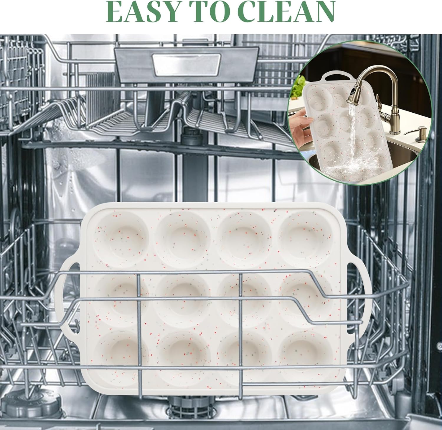 - EASY TO CLEAN: The non-stick surface of our silicone muffin pans for baking makes cleaning a breeze. Rinse with water or place in the dishwasher. After cleaning, you can hang it on a hook to dry