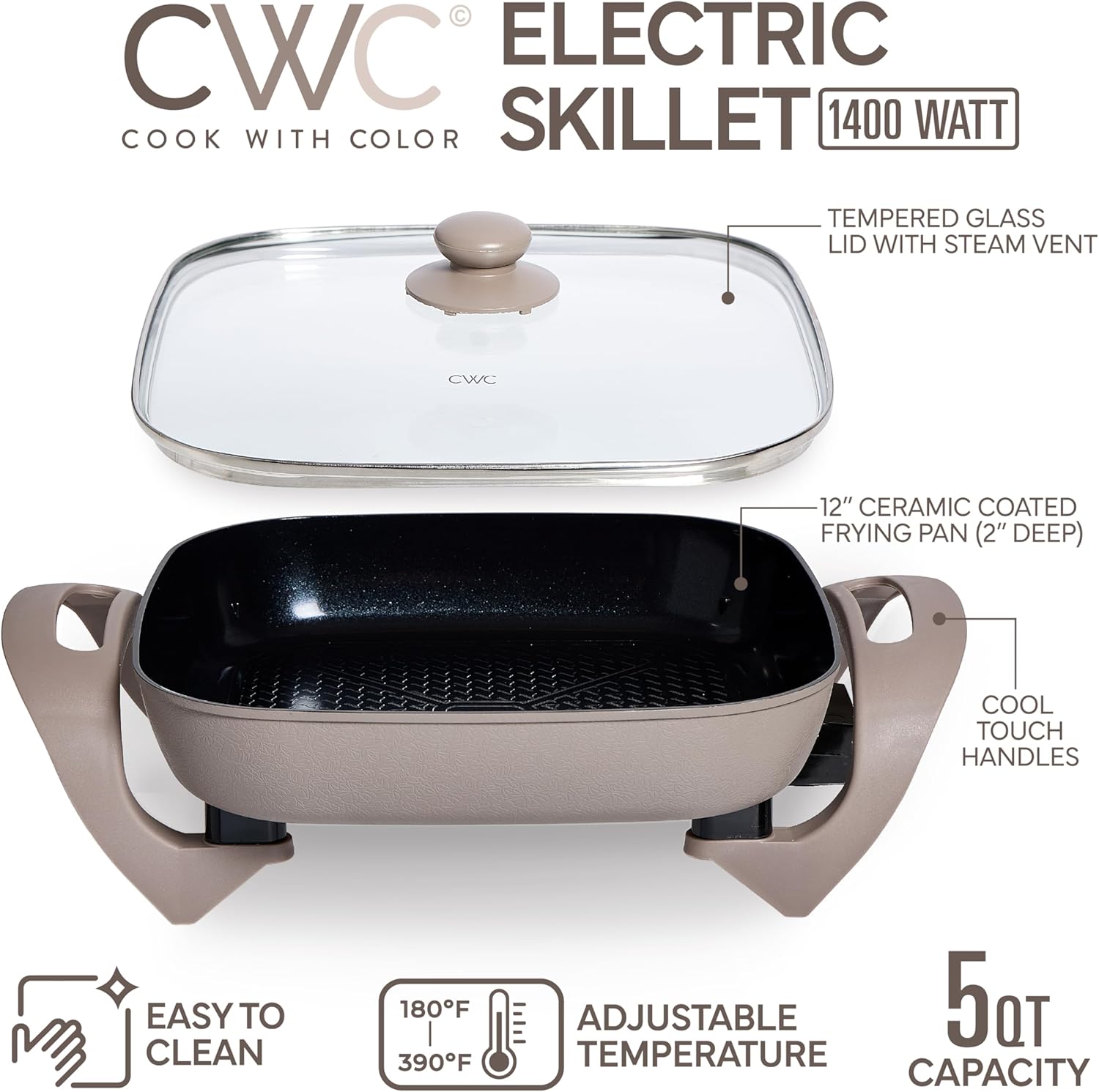 COOK WITH COLOR Electric Skillet - 12" x 12" Ceramic Nonstick Pan, PFAS-Free, 1400W, Tempered Glass Lid, Variable Temperature, Removable Heating Probe, Cool-Touch Handles, Greige