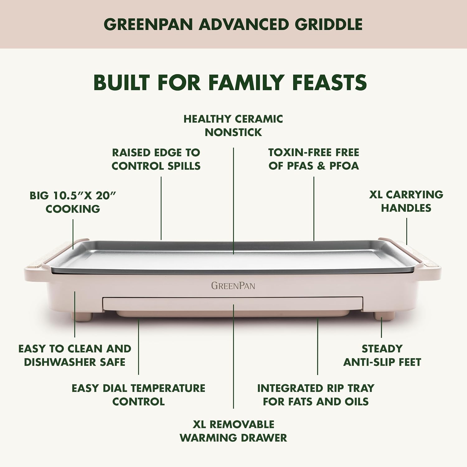 GreenPan Advanced 10.5”x 20” Electric Griddle with Warming Drawer, Healthy Ceramic Nonstick PFAS-Free Coating, Temperature Control, Easy and Versatile Countertop Meals, Dishwasher Safe, Clay