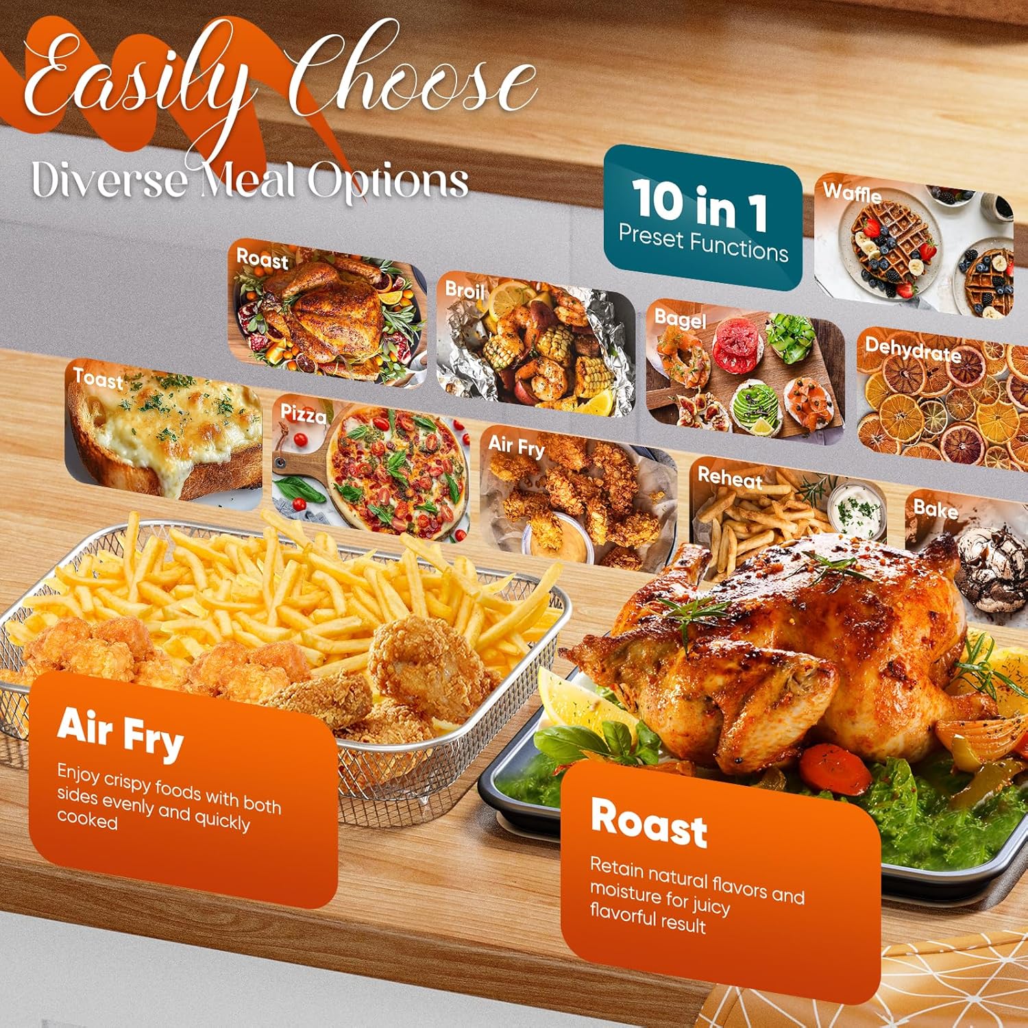 - 10 PRE-PROGRAMMED PRESETS - This premium 1800-watt toaster oven and air fryer features 10 functions: Air Fry, Grill, Bake, Reheat, Bagel, Pizza, Toast, Broil, Waffle, Dehydrate, Frozen and Keep Warm, all in one powerful appliance.