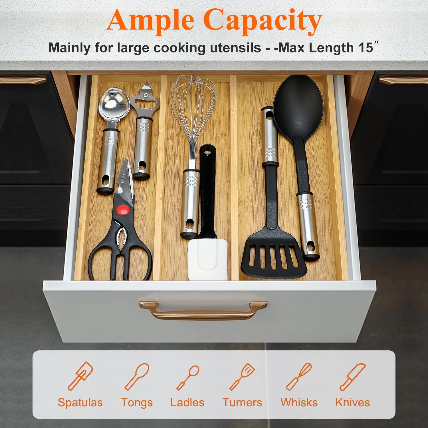 - Ample Capacity: Featuring 2 large compartments and 1 expandable slots on the side, this utensil drawer organizer offers ample space for storing most cooking utensils in the kitchen, such as spatula, ladle, cooking spoon, tongs, utensil sets, and whisks. Makes the drawer look more put together and organized.