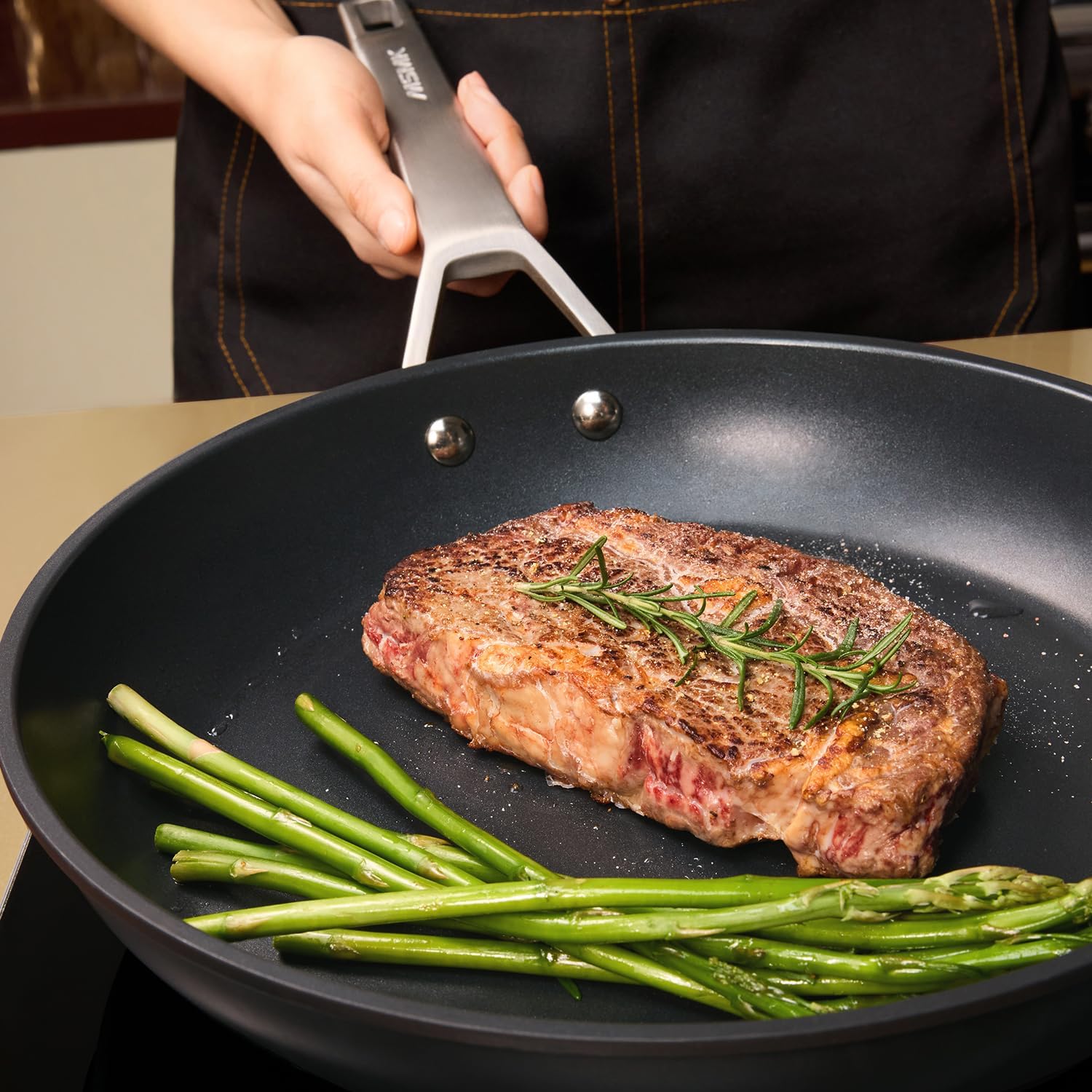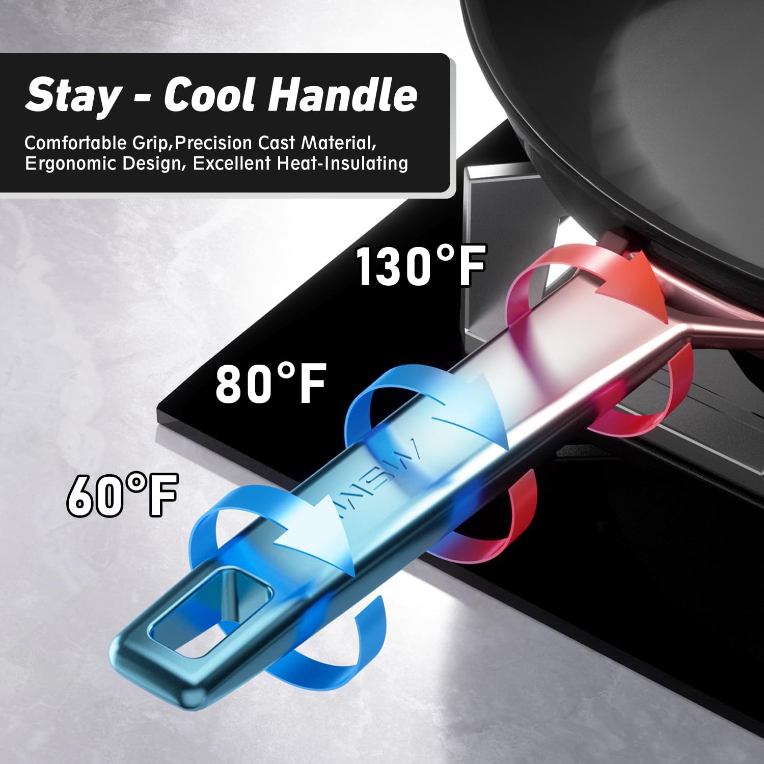 - STAY-COOL STEEL HANDLE: The small pan Y-shaped structure allows the handle to dissipate heat effectively and keep the handle cool continuously. Double-riveted for exceptional strength and maneuverability, the ceramic skillet pan empowers you to seamlessly transition from stovetop to oven.The sealed design prevents any soup or sauce from getting inside, making it easy to clean.