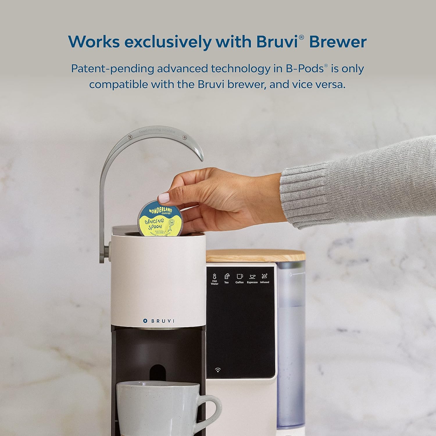 - BRUVI BREWER WORKS EXCLUSIVELY WITH BRUVI B-PODS: Patent-pending advanced technology in B-PODS is only compatible with the Bruvi brewer, and vice versa. Bruvi reusable pod is also available. Do not use other types of pods with Bruvi.