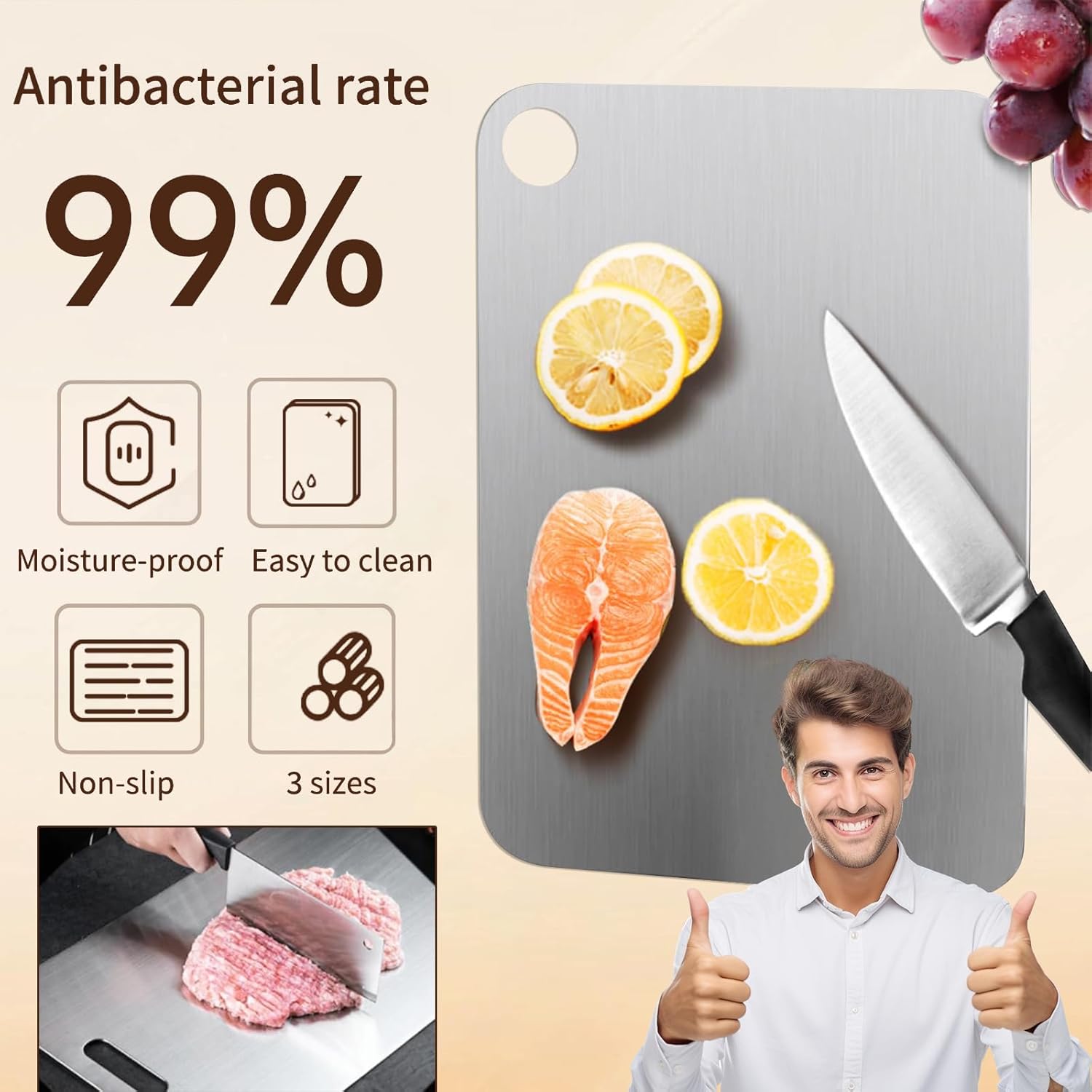 - ăSafe Cutting Board for KitchenăOur New Upgrade Titanium Cutting Board,Stainless steel Cutting Board represents a major leap forward from traditional plastic and wooden boards. With advanced features and improvements, this cutting board addresses common issues such as crumbs, cuts, and odor absorption. Designed to maintain hygiene and durability, it ensures a cleaner, healthier kitchen experience. Upgrade to our cutting board for superior performance and protection for your culinary needs.