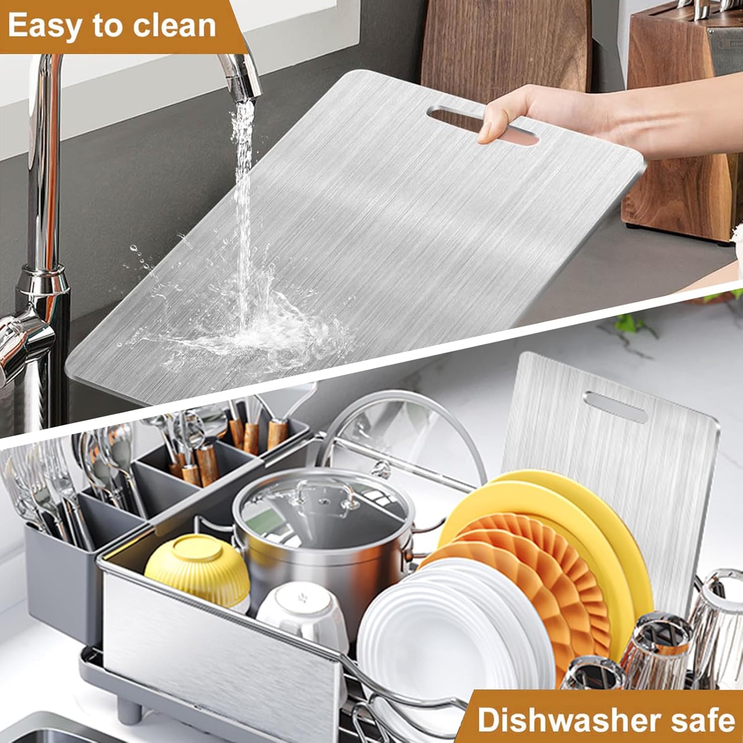 - ăEasy to Clean and Maintaină: The non-porous, smooth surface of the titanium board makes it incredibly easy to clean. Simply rinse with warm water and mild soap or place it in the dishwasher for a hassle-free clean-up.Enjoy the practicality of our Titanium Cutting Board, which not only provides a durable cutting surface but is also easy to clean and maintain, ensuring a hygienic kitchen environment.
