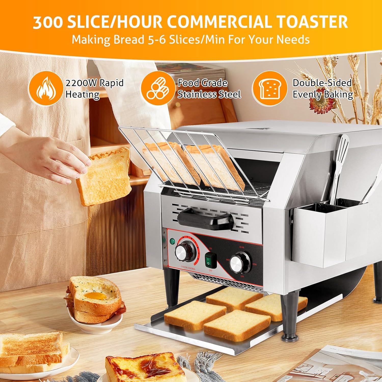 - 【High Efficiency Commercial Toaster】- The commercial conveyor toaster is efficiently high-power fast baking, which can evenly toast up to 300 slices of bread per hour. Great conveyor toaster for any commercial use, restaurants or bakery Use, office, hotel, school, cafeteria, and breakfast of big family.