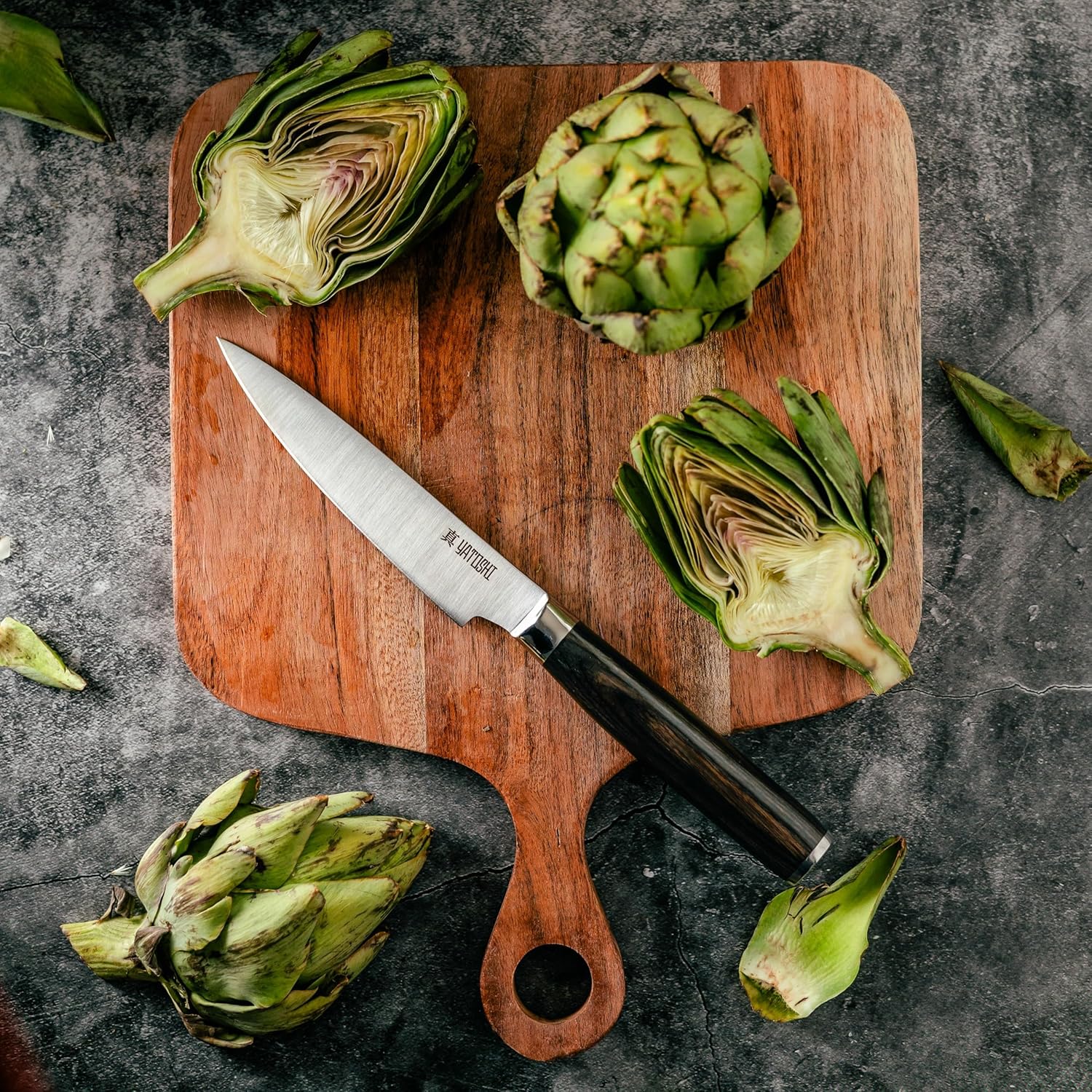 - High Carbon Blades: Made with premium 7Cr17 High Carbon Steel that provides a razor-sharp professional quality blade. The steel contains 0.6-0.75 carbon, making it two times tougher than other knives in its class with a Rockwell Hardness of 57-58.