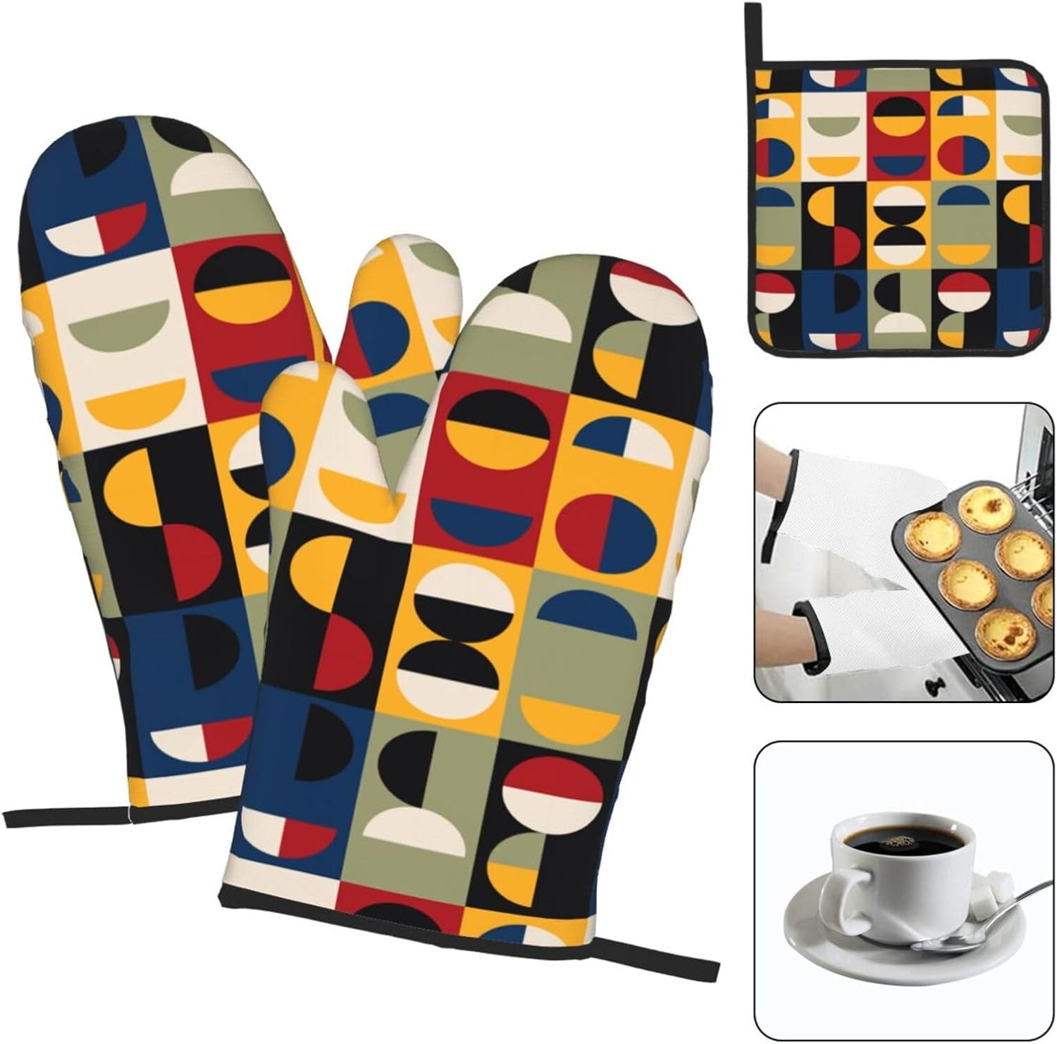 Retro Mid Century Modern Oven Mitts and Pot Holders Set Vintage Decorative Heat Resistant Microwave Oven Gloves for BBQ Baking Grilling Cooks Kitchen Decor 3 Piece