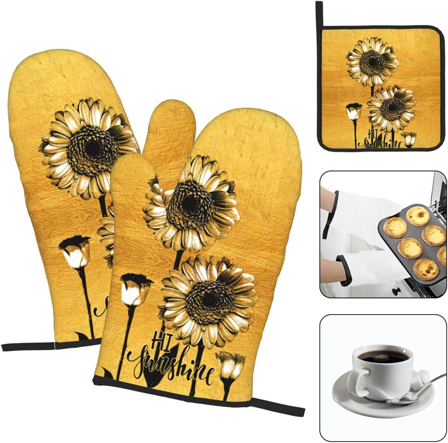- Size: Gold kitchen oven gloves measure 7.2 x 11 inch and hot pads measure 8 x 8 inch,It is great for sunflower gifts for women, kitchen gifts for women cooks bakers,cooking gifts for women etc