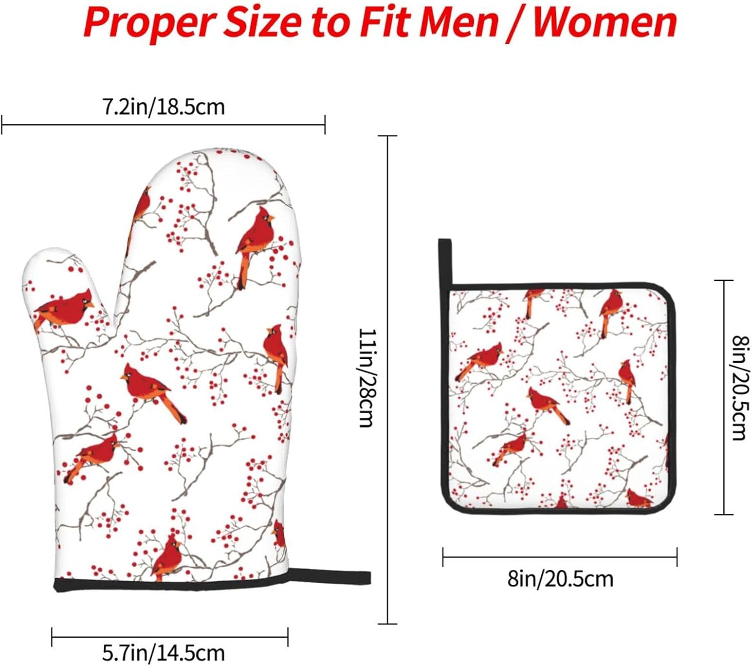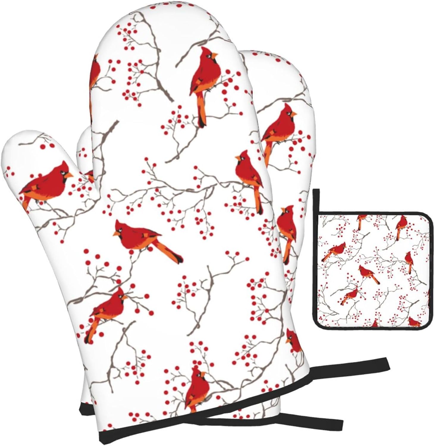 Cardinal Bird Red Berry Decor Oven Mitts and Pot Holders Sets of 3 Heat Resistant Non Slip BBQ Gloves for Cooking Grilling Baking Holiday Kitchen Decor