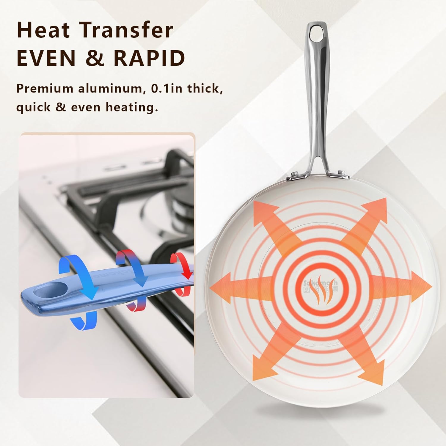 - Superior Nonstick Performance: Our frying pan features a premium ceramic nonstick coating that ensures effortless food release, making it perfect for cooking eggs, pancakes, and delicate foods without sticking. Cleanup is a breeze with minimal scrubbing required.