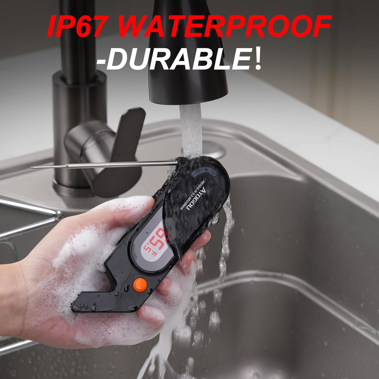 - [ IP67 waterproof, more durable, easy to clean ] When measuring temperature, food, meat, oil, etc. can easily make the thermometer dirty. IPX7 waterproof makes the cooking thermometer more durable and more convenient to wash directly with water.(Note: Do not wash in the dishwasher)