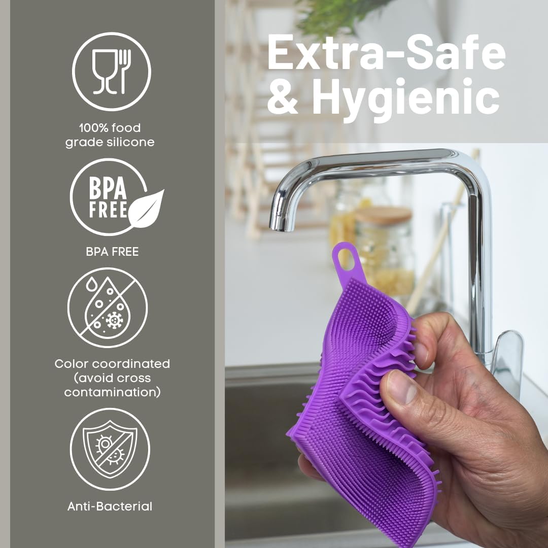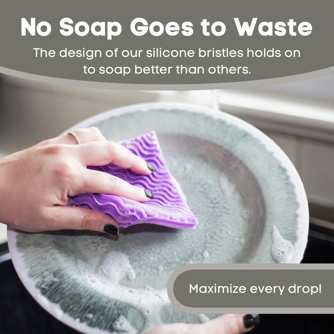 - Unlike other silicone dish scrubber designs that don't hold on to soap - so you have to keep adding more - our silicone sponges for dishes works efficiently with your favorite soaps and degreasers, so you can use less cleaning fluids. In fact, this kitchen scrubber is designed to make cleaning more efficient all around