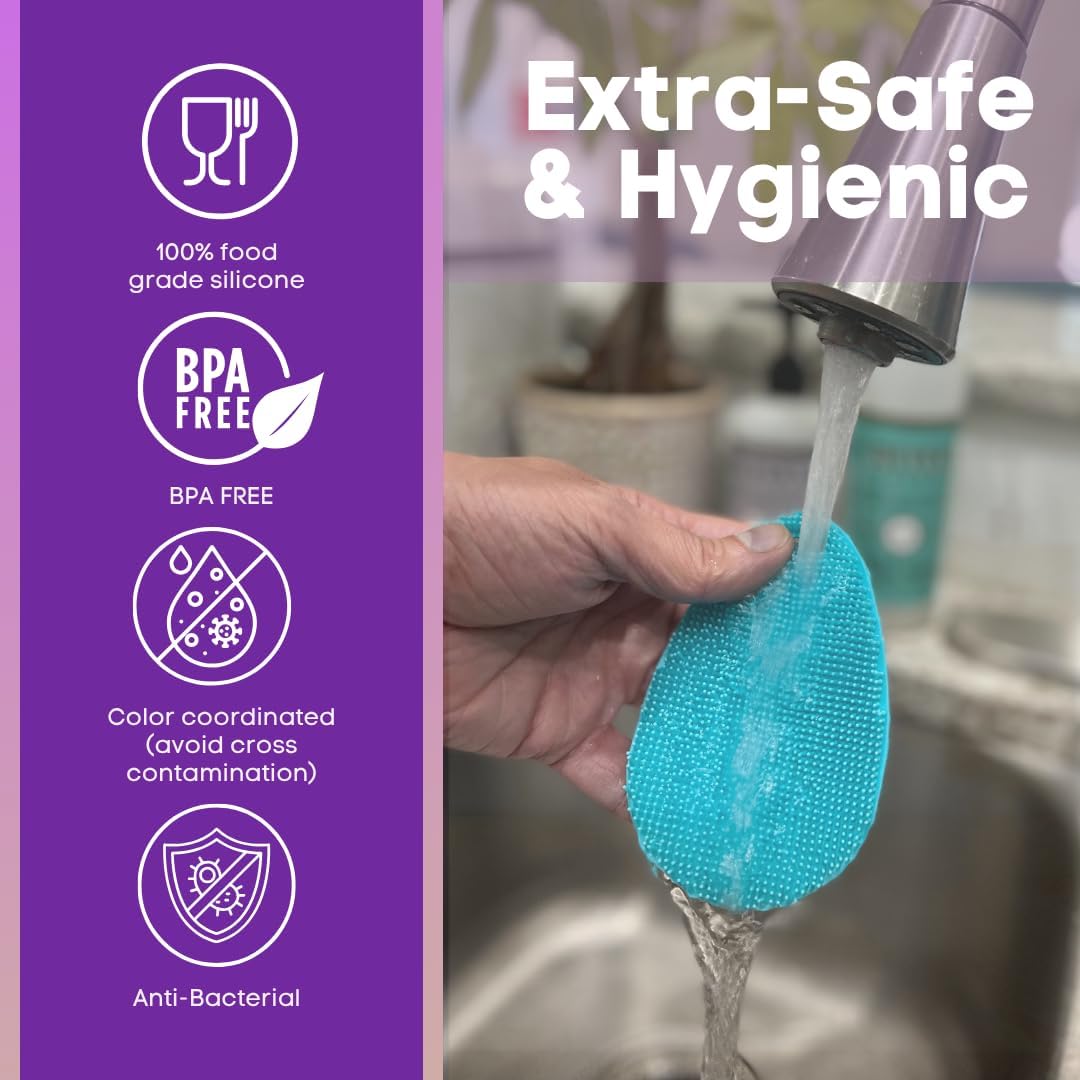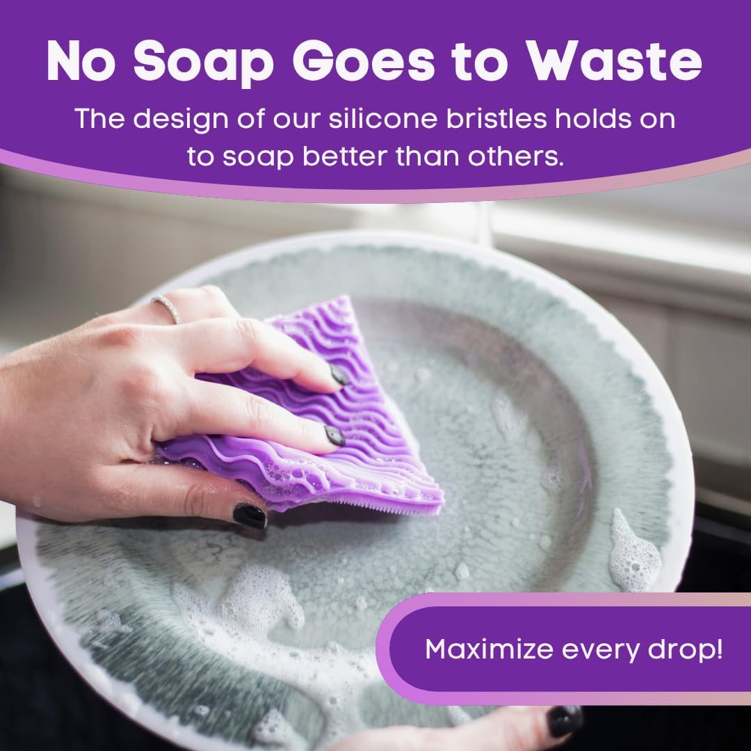 - Unlike other silicone dish scrubber designs that don't hold on to soap - so you have to keep adding more - our silicone sponges for dishes works efficiently with your favorite soaps and degreasers, so you can use less cleaning fluids. In fact, this kitchen scrubber is designed to make cleaning more efficient all around