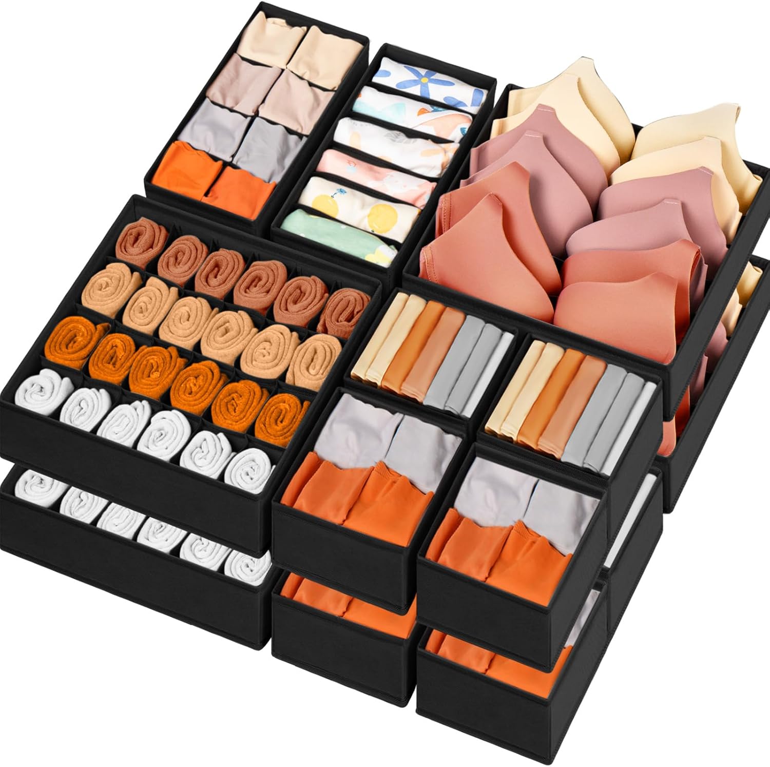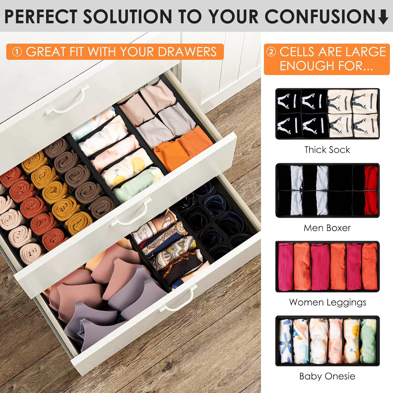 - ăCOMPARTMENTS FOR MULTI STORAGE USEăCompared to others, our 16 pack drawer organizer set has 5 sizes for various storage needs. No matter it's knee sock, men boxer brief, or women leggings, they will all perfectly fit into our clothes organizer. Great for bedroom organization and dorm room storage.