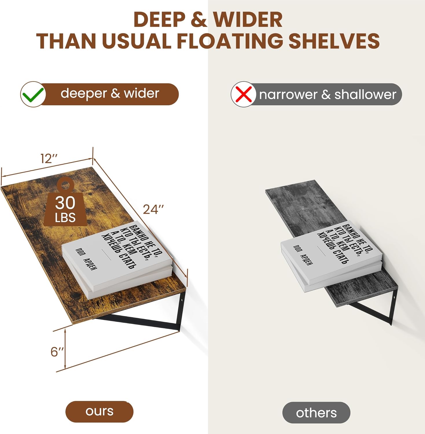 - [Size Does Matter] - These wall shelves are wider and longer than regular shelves on the market, providing more room and worry-free storage! Measures: 24Wx12Dx5.8H Easy to install within a few minutes with all necessary hardware included.