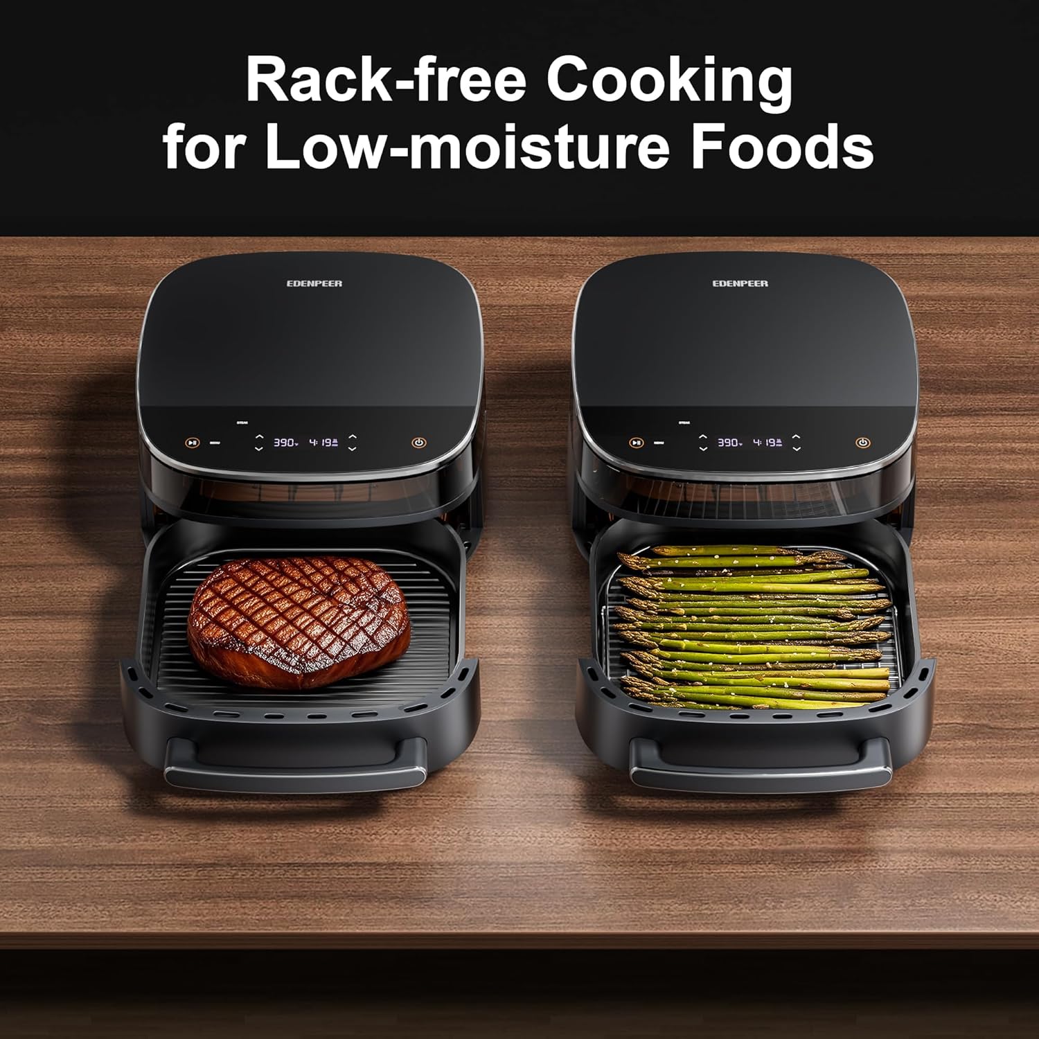 - 11-IN-1 Versatility: EDENPEER air fryer non toxic includes function - FRIES, STEAK, WINGS, FISH, PRAWN, VEGGIE, BACON, DEHYDRATE, REHEAT, PROZEN PIZZA, FRESH PIZZA, Perfect alternative for some kitchen appliance, like oven, microwave, dehydrator and toaster.