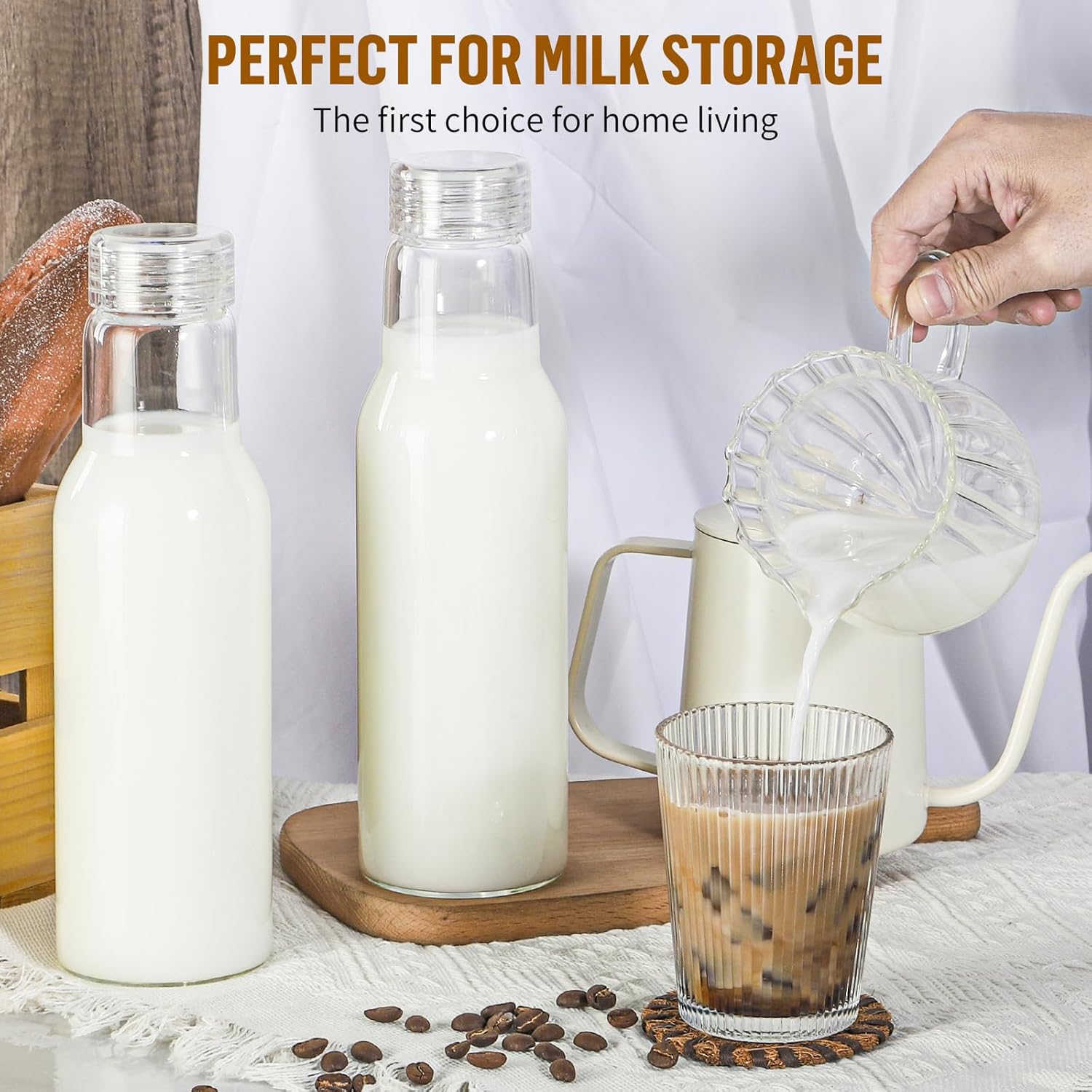 - 【Excellent Quality and Versatility】 The 25oz glass bottles can be used for storing and dispensing milk and other beverages, but also can also be used as fruit wine bottles or for storing food, and the food-grade glass allows you to be confident in their versatility