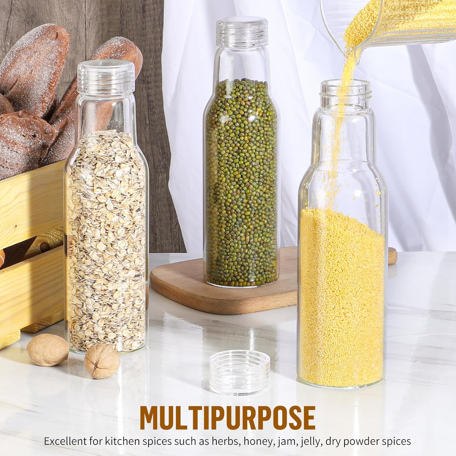 - 【Excellent Airtight and Leakproof】The glass jars with lid and silicone seal, making it double airtight and leak-proof for kitchen storage, and it does not leak when the bottle is inverted