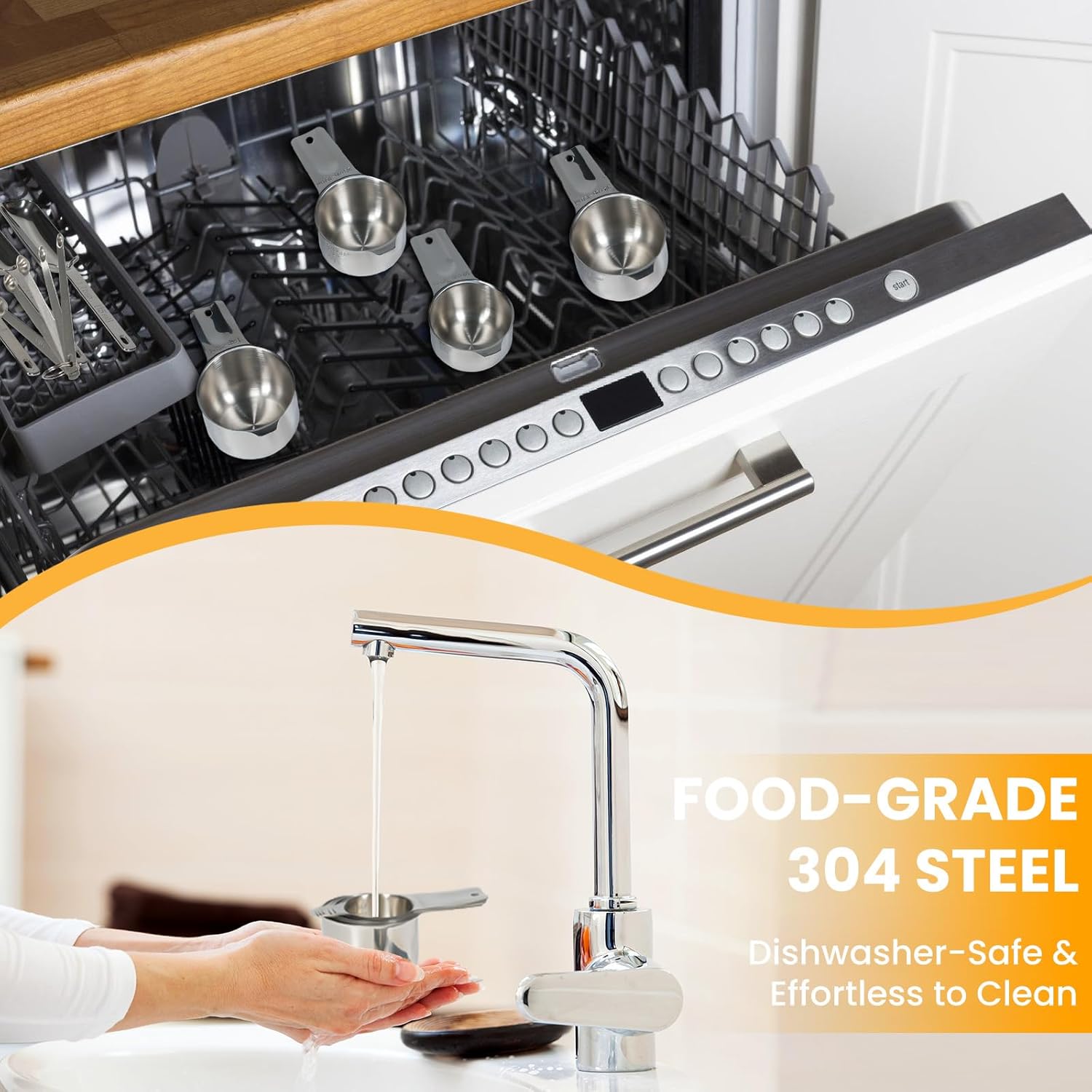 - CLEAR ENGRAVED MARKINGS: Cups and spoons set features precise US and metric measurements engraved on each piece, ensuring accuracy for baking and cooking. Accurate measurements can help you make great tasting food every time, no more inaccurate portion sizes that affect taste. Goodbye to kitchen guesswork!