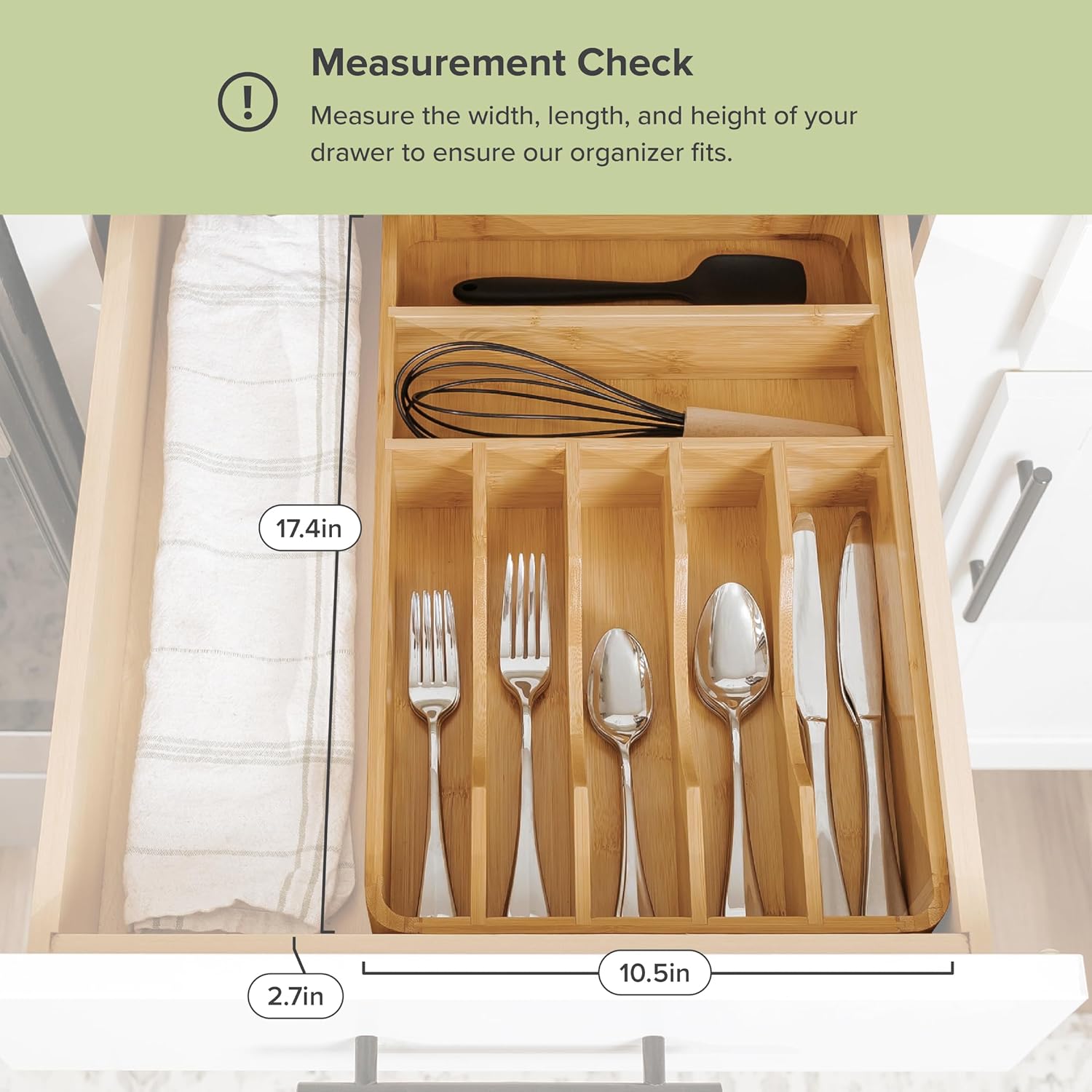 KitchenEdge Silverware Organizer - Cutlery, Flatware, and Utensil Holder for Kitchen Drawers, Fixed 10.5” Width, 7 Storage Compartments, Non-Slip Feet, Rounded Corners, 100% Bamboo