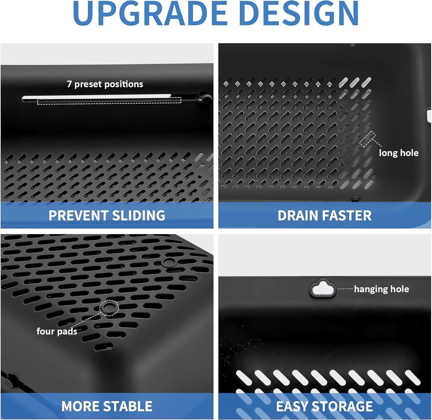 - LASSHSWA upgrade the colander, 7 preset positions - PREVENT SLIDING, long hole - DRAIN FASTER, four pads - MORE STABLE, hanging hole - EASY STORAGE.