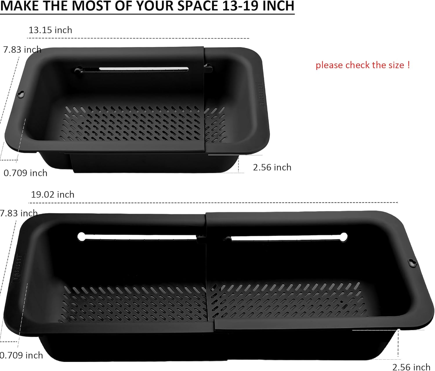 - LASSHSWA Over the sink extendable strainer, SIZE: 13-19 in (smaller space-saving design) . Stainless steel drain strainer, SIZE: Outer diameter: 4.5”; inner filter: 3”; depth: 1” . They fit for most kitchen sinks and drains.