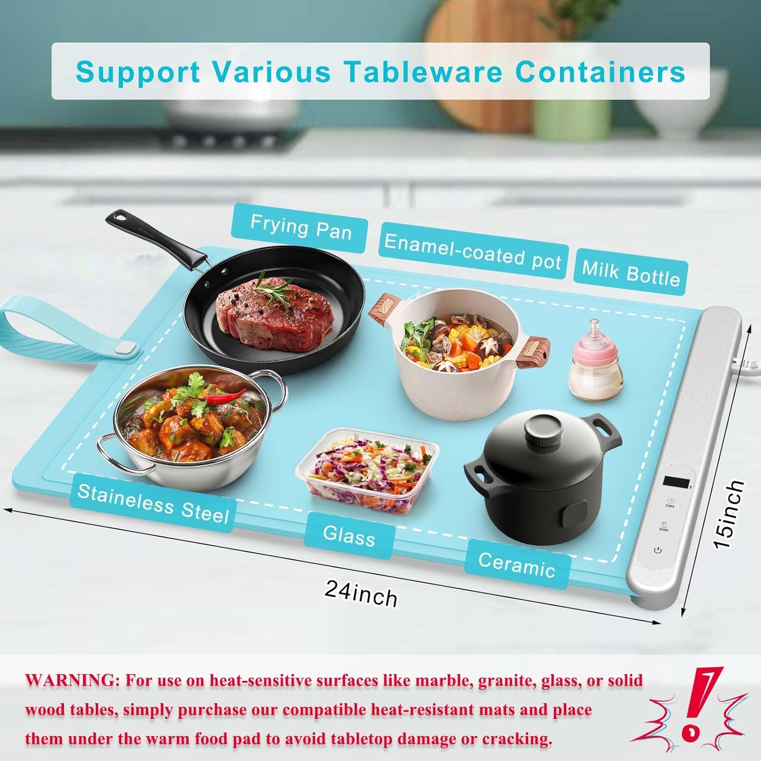 - Premium Silicone Nano Material: Our electric warming tray is made of premium flexible silicone nano material, which is splash-proof, stain-proof and oil-proof, combining durability and practicality. It can be folded and stored without creases, guaranteeing long-lasting use.