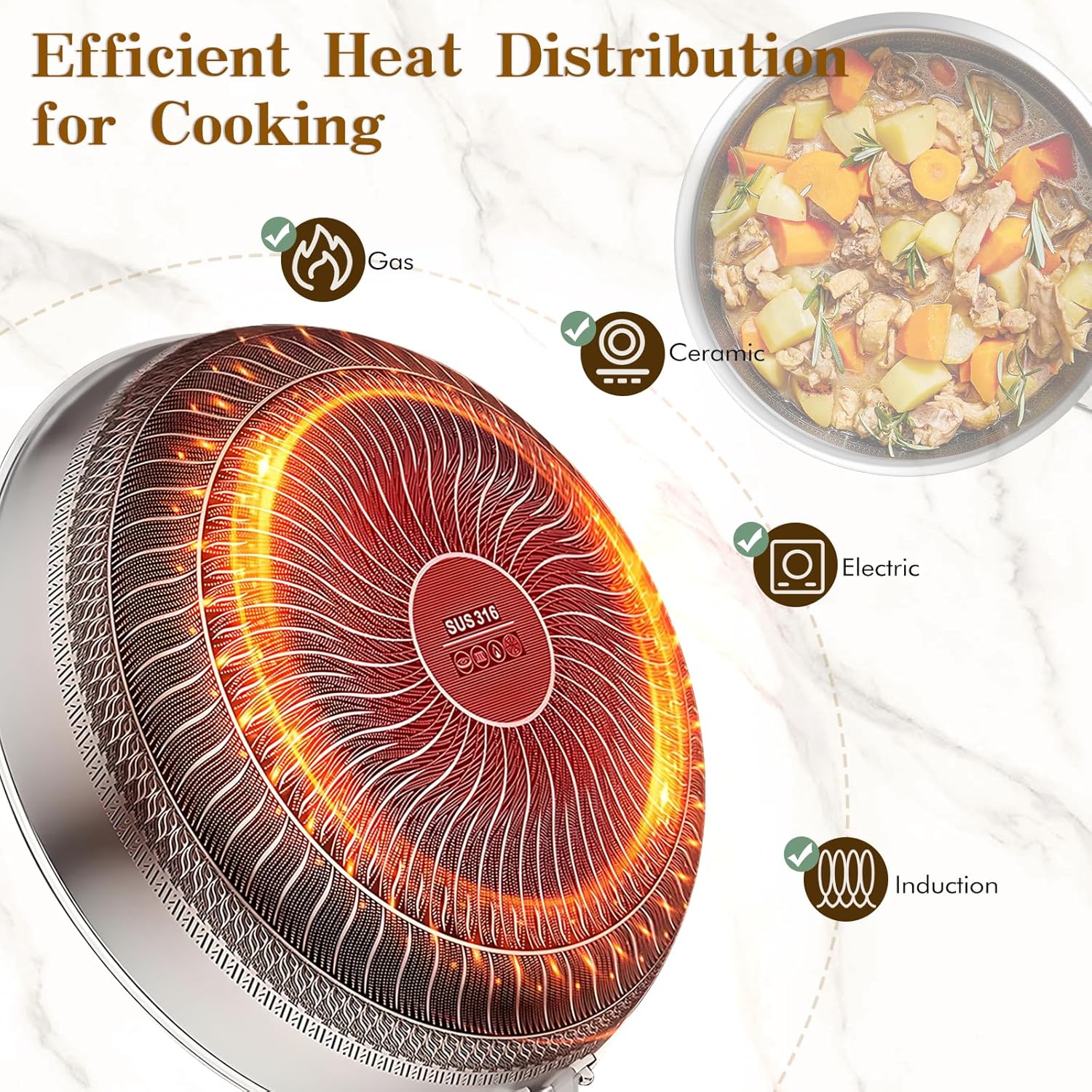 - Hybrid Technology for Superior Cooking: Our skillet features advanced tri-ply construction, combining aluminum sandwiched between two layers of high-quality stainless steel. This innovative design enhances conductivity for even heating while providing the durability and searing power of stainless steel