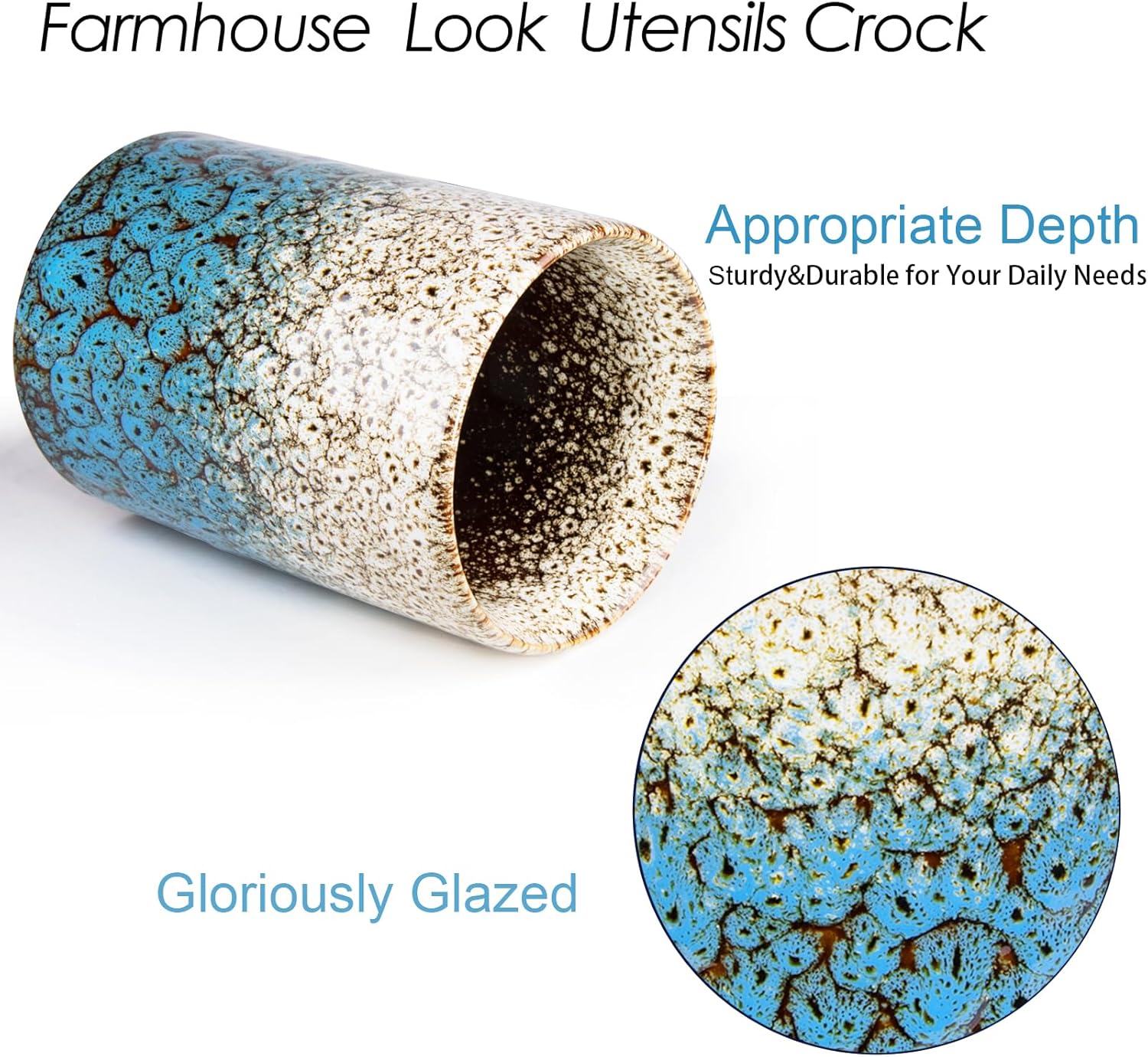 Utensil Holder, Ceramic Kitchen Utensil Holder for Countertop, Large Cooking Utensil Crocks for Kitchen Counter, Morden Utensil Organizer for Spatula, kitchen Decor,White & Blue