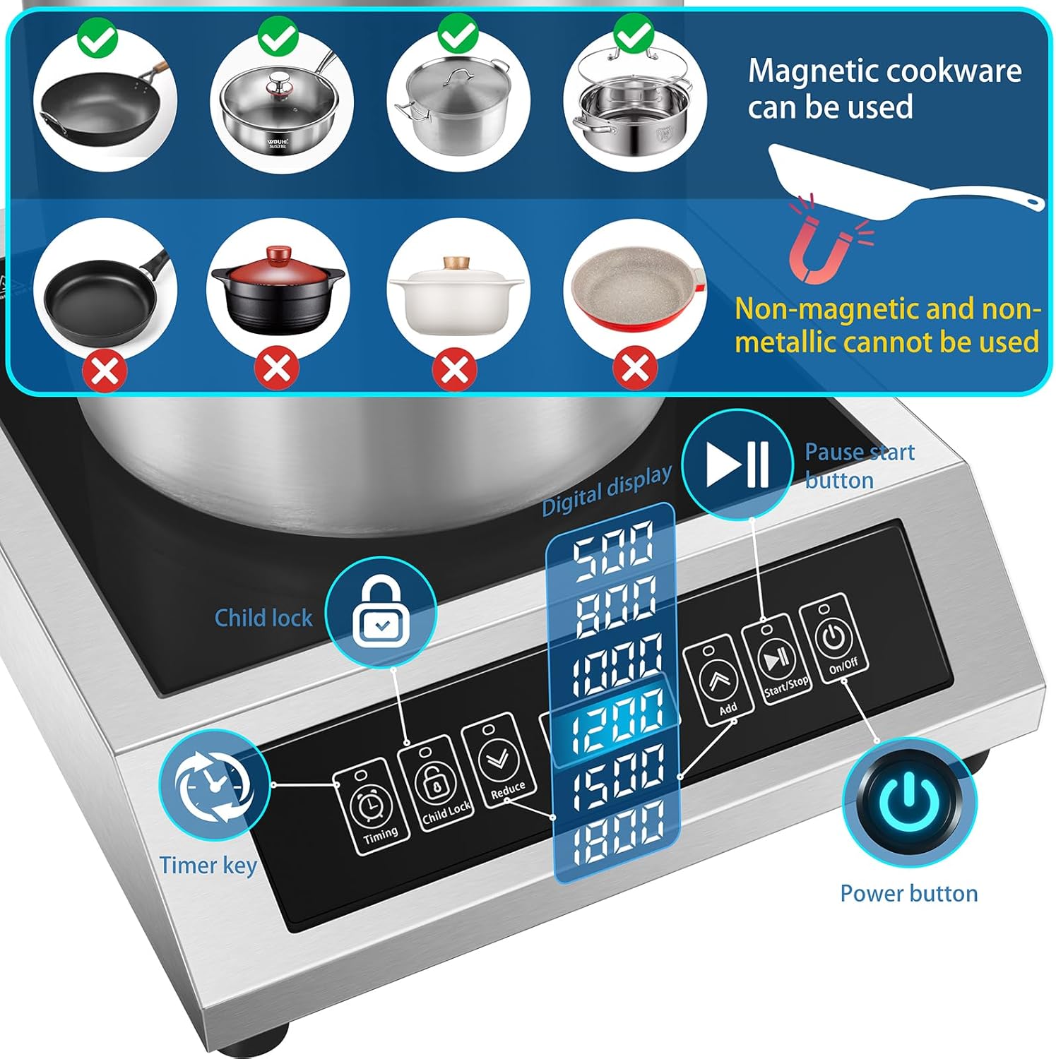 - POWERFUL PERFORMANCE: Commercial Range Countertop Burner is equipped with 120vV1800W power, fast heating speed, timer function suitable for commercial home, western restaurant, deli, convenience store